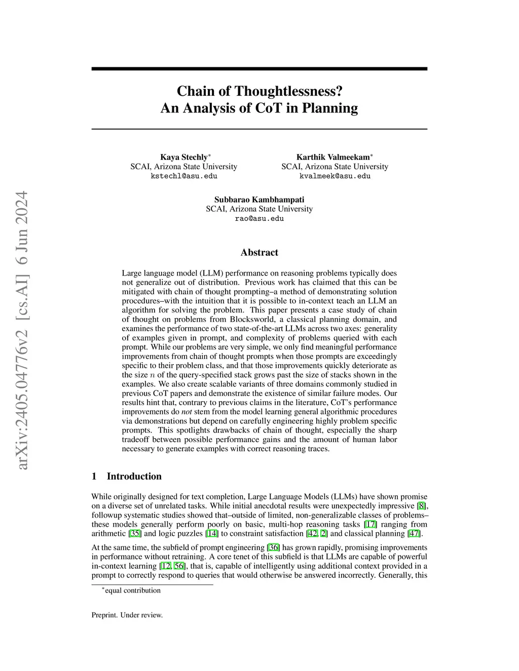 Large language model (LLM) performance on reasoning problems typically does not generalize out of distribution. Previous work has claimed that this can be mitigated with chain of thought prompting-a method of demonstrating solution procedures-with the intuition that it is possible to in-context teach an LLM an algorithm for solving the problem. This paper presents a case study of chain of thought on problems from Blocksworld, a classical planning domain, and examines the performance of two state-of-the-art LLMs across two axes: generality of examples given in prompt, and complexity of problems queried with each prompt. While our problems are very simple, we only find meaningful performance improvements from chain of thought prompts when those prompts are exceedingly specific to their problem class, and that those improvements quickly deteriorate as the size n of the query-specified stack grows past the size of stacks shown in the examples. We also create scalable variants of three domains commonly studied in previous CoT papers and demonstrate the existence of similar failure modes. Our results hint that, contrary to previous claims in the literature, CoT's performance improvements do not stem from the model learning general algorithmic procedures via demonstrations but depend on carefully engineering highly problem specific prompts. This spotlights drawbacks of chain of thought, especially the sharp tradeoff between possible performance gains and the amount of human labor necessary to generate examples with correct reasoning traces.
