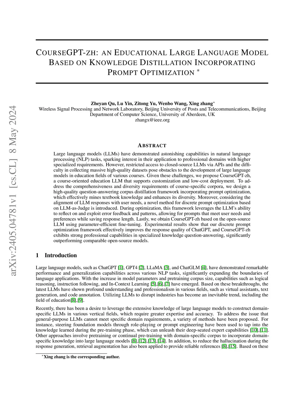 Large language models (LLMs) have demonstrated astonishing capabilities in natural language processing (NLP) tasks, sparking interest in their application to professional domains with higher specialized requirements. However, restricted access to closed-source LLMs via APIs and the difficulty in collecting massive high-quality datasets pose obstacles to the development of large language models in education fields of various courses. Given these challenges, we propose CourseGPT-zh, a course-oriented education LLM that supports customization and low-cost deployment. To address the comprehensiveness and diversity requirements of course-specific corpora, we design a high-quality question-answering corpus distillation framework incorporating prompt optimization, which effectively mines textbook knowledge and enhances its diversity. Moreover, considering the alignment of LLM responses with user needs, a novel method for discrete prompt optimization based on LLM-as-Judge is introduced. During optimization, this framework leverages the LLM's ability to reflect on and exploit error feedback and patterns, allowing for prompts that meet user needs and preferences while saving response length. Lastly, we obtain CourseGPT-zh based on the open-source LLM using parameter-efficient fine-tuning. Experimental results show that our discrete prompt optimization framework effectively improves the response quality of ChatGPT, and CourseGPT-zh exhibits strong professional capabilities in specialized knowledge question-answering, significantly outperforming comparable open-source models.
