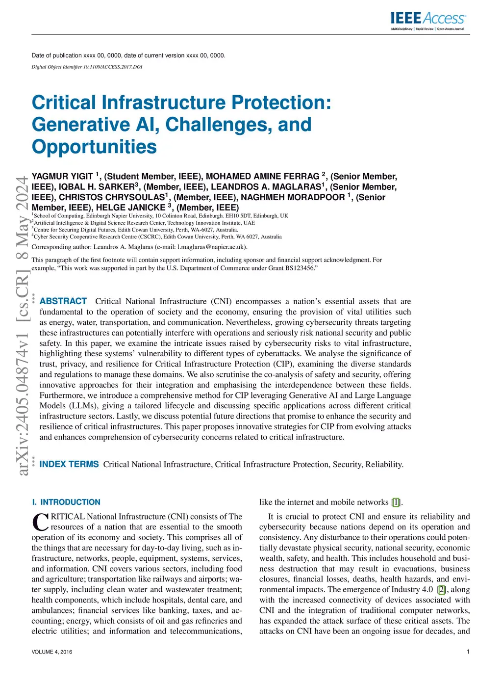 Critical National Infrastructure (CNI) encompasses a nation's essential assets that are fundamental to the operation of society and the economy, ensuring the provision of vital utilities such as energy, water, transportation, and communication. Nevertheless, growing cybersecurity threats targeting these infrastructures can potentially interfere with operations and seriously risk national security and public safety. In this paper, we examine the intricate issues raised by cybersecurity risks to vital infrastructure, highlighting these systems' vulnerability to different types of cyberattacks. We analyse the significance of trust, privacy, and resilience for Critical Infrastructure Protection (CIP), examining the diverse standards and regulations to manage these domains. We also scrutinise the co-analysis of safety and security, offering innovative approaches for their integration and emphasising the interdependence between these fields. Furthermore, we introduce a comprehensive method for CIP leveraging Generative AI and Large Language Models (LLMs), giving a tailored lifecycle and discussing specific applications across different critical infrastructure sectors. Lastly, we discuss potential future directions that promise to enhance the security and resilience of critical infrastructures. This paper proposes innovative strategies for CIP from evolving attacks and enhances comprehension of cybersecurity concerns related to critical infrastructure.