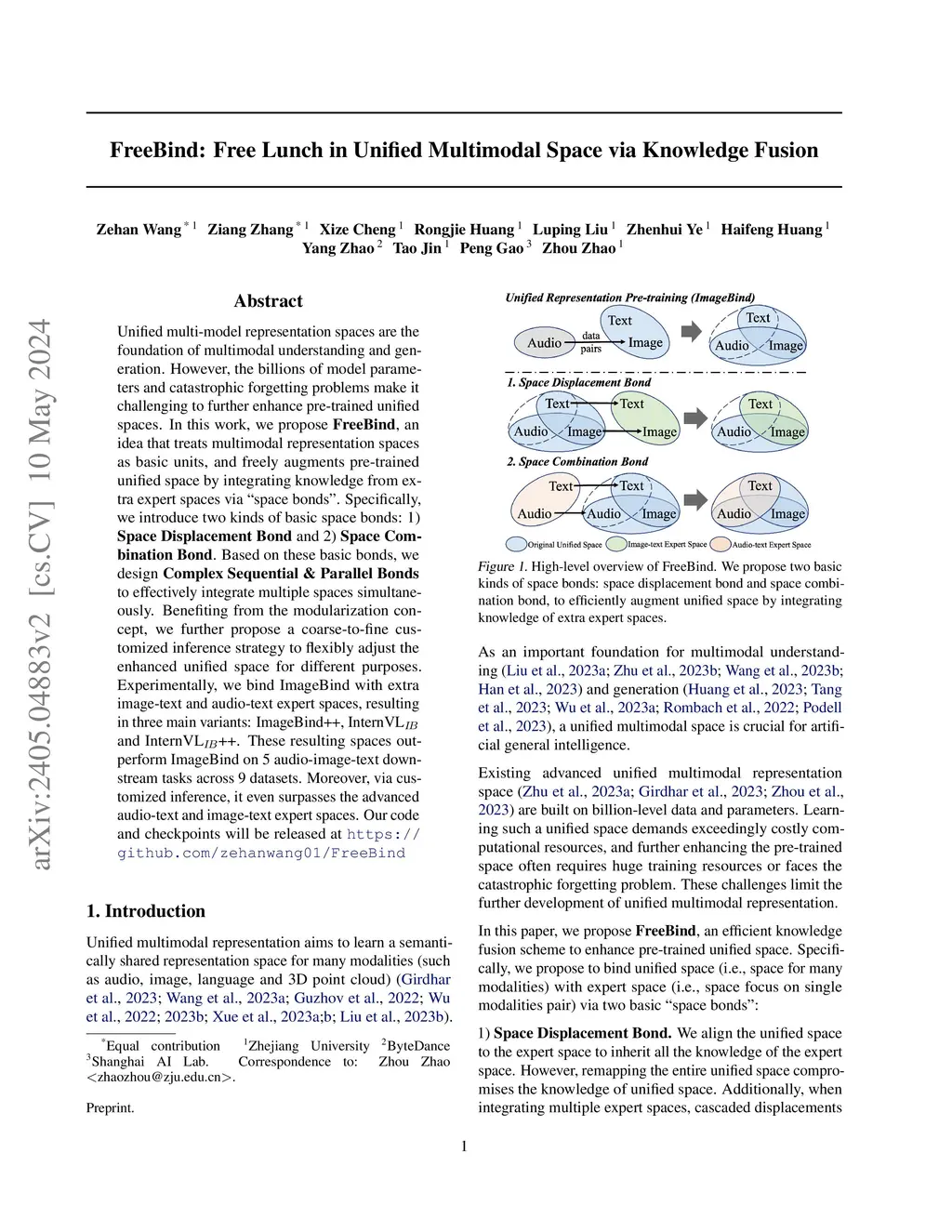 Unified multi-model representation spaces are the foundation of multimodal understanding and generation. However, the billions of model parameters and catastrophic forgetting problems make it challenging to further enhance pre-trained unified spaces. In this work, we propose FreeBind, an idea that treats multimodal representation spaces as basic units, and freely augments pre-trained unified space by integrating knowledge from extra expert spaces via "space bonds". Specifically, we introduce two kinds of basic space bonds: 1) Space Displacement Bond and 2) Space Combination Bond. Based on these basic bonds, we design Complex Sequential & Parallel Bonds to effectively integrate multiple spaces simultaneously. Benefiting from the modularization concept, we further propose a coarse-to-fine customized inference strategy to flexibly adjust the enhanced unified space for different purposes. Experimentally, we bind ImageBind with extra image-text and audio-text expert spaces, resulting in three main variants: ImageBind++, InternVL_IB, and InternVL_IB++. These resulting spaces outperform ImageBind on 5 audio-image-text downstream tasks across 9 datasets. Moreover, via customized inference, it even surpasses the advanced audio-text and image-text expert spaces.