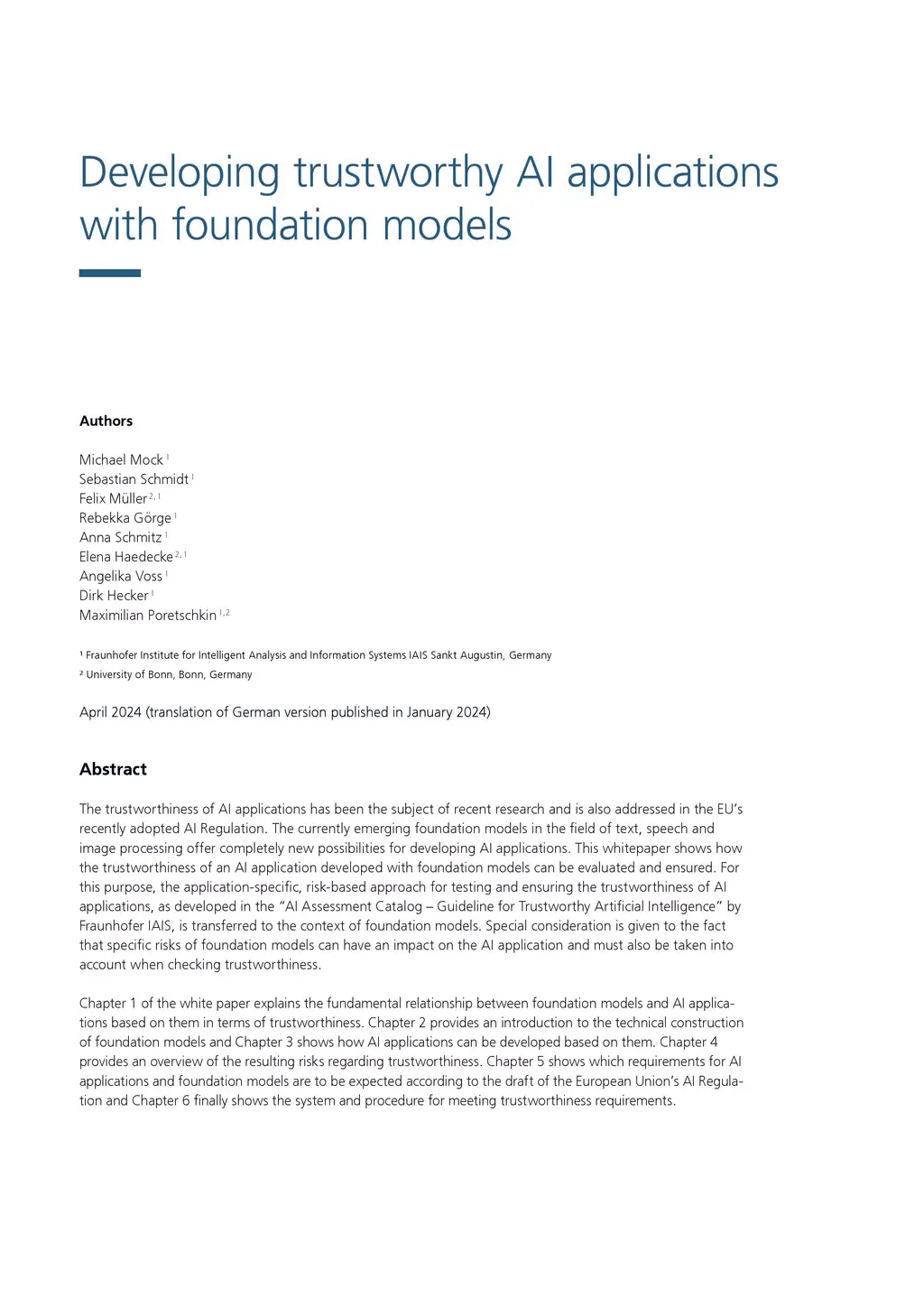 The trustworthiness of AI applications has been the subject of recent research and is also addressed in the EU's recently adopted AI Regulation. The currently emerging foundation models in the field of text, speech and image processing offer completely new possibilities for developing AI applications. This whitepaper shows how the trustworthiness of an AI application developed with foundation models can be evaluated and ensured. For this purpose, the application-specific, risk-based approach for testing and ensuring the trustworthiness of AI applications, as developed in the ÁI Assessment Catalog - Guideline for Trustworthy Artificial Intelligence' by Fraunhofer IAIS, is transferred to the context of foundation models. Special consideration is given to the fact that specific risks of foundation models can have an impact on the AI application and must also be taken into account when checking trustworthiness. Chapter 1 of the white paper explains the fundamental relationship between foundation models and AI applications based on them in terms of trustworthiness. Chapter 2 provides an introduction to the technical construction of foundation models and Chapter 3 shows how AI applications can be developed based on them. Chapter 4 provides an overview of the resulting risks regarding trustworthiness. Chapter 5 shows which requirements for AI applications and foundation models are to be expected according to the draft of the European Union's AI Regulation and Chapter 6 finally shows the system and procedure for meeting trustworthiness requirements.