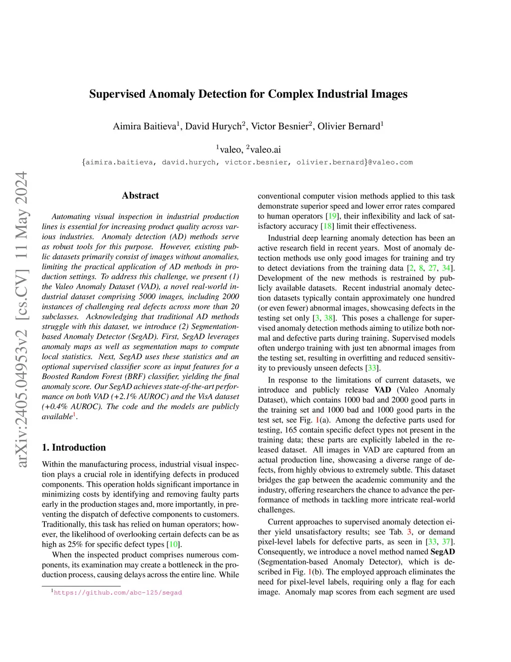 Automating visual inspection in industrial production lines is essential for increasing product quality across various industries. Anomaly detection (AD) methods serve as robust tools for this purpose. However, existing public datasets primarily consist of images without anomalies, limiting the practical application of AD methods in production settings. To address this challenge, we present (1) the Valeo Anomaly Dataset (VAD), a novel real-world industrial dataset comprising 5000 images, including 2000 instances of challenging real defects across more than 20 subclasses. Acknowledging that traditional AD methods struggle with this dataset, we introduce (2) Segmentation-based Anomaly Detector (SegAD). First, SegAD leverages anomaly maps as well as segmentation maps to compute local statistics. Next, SegAD uses these statistics and an optional supervised classifier score as input features for a Boosted Random Forest (BRF) classifier, yielding the final anomaly score. Our SegAD achieves state-of-the-art performance on both VAD (+2.1% AUROC) and the VisA dataset (+0.4% AUROC). The code and the models are publicly available.