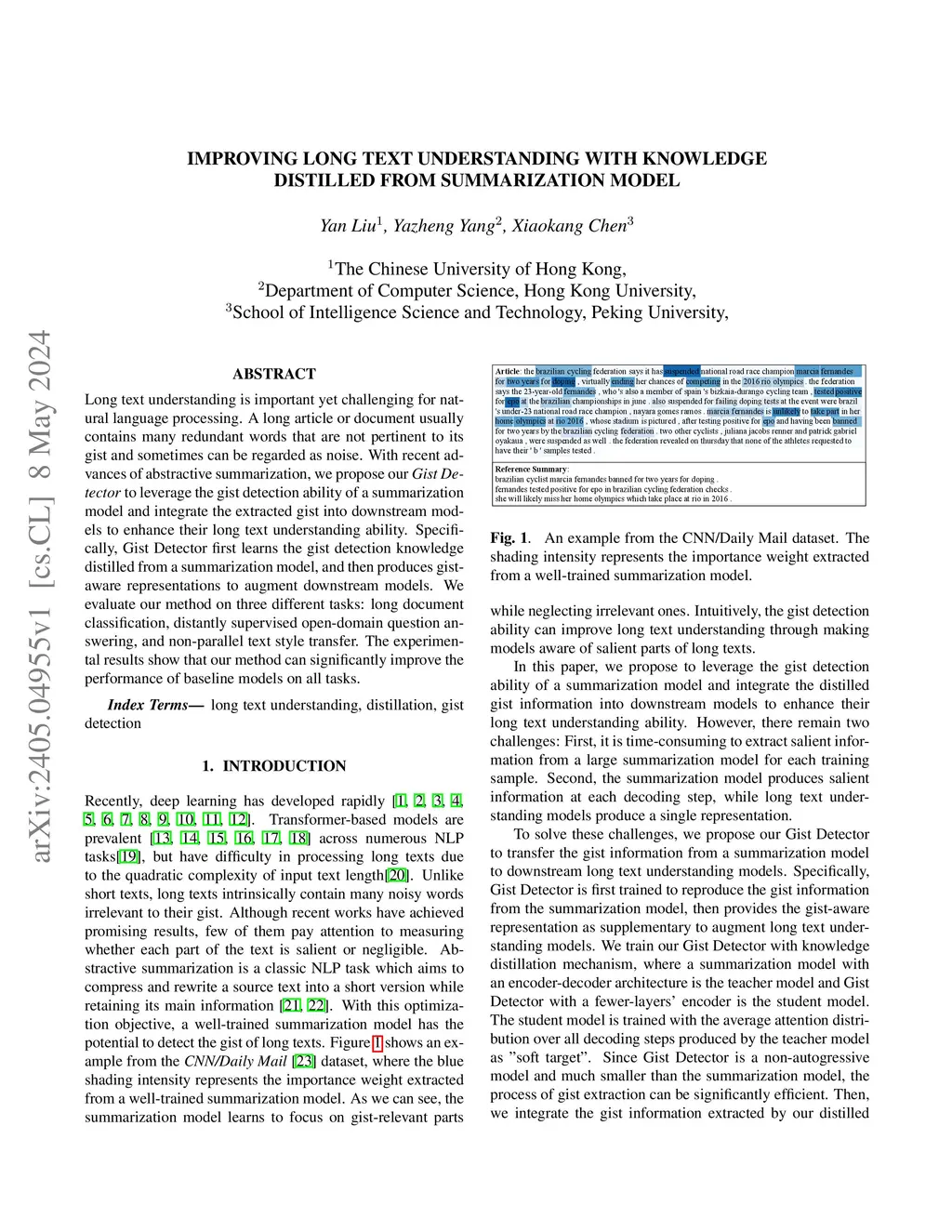 Long text understanding is important yet challenging for natural language processing. A long article or document usually contains many redundant words that are not pertinent to its gist and sometimes can be regarded as noise. With recent advances of abstractive summarization, we propose our \emph{Gist Detector} to leverage the gist detection ability of a summarization model and integrate the extracted gist into downstream models to enhance their long text understanding ability. Specifically, Gist Detector first learns the gist detection knowledge distilled from a summarization model, and then produces gist-aware representations to augment downstream models. We evaluate our method on three different tasks: long document classification, distantly supervised open-domain question answering, and non-parallel text style transfer. The experimental results show that our method can significantly improve the performance of baseline models on all tasks.