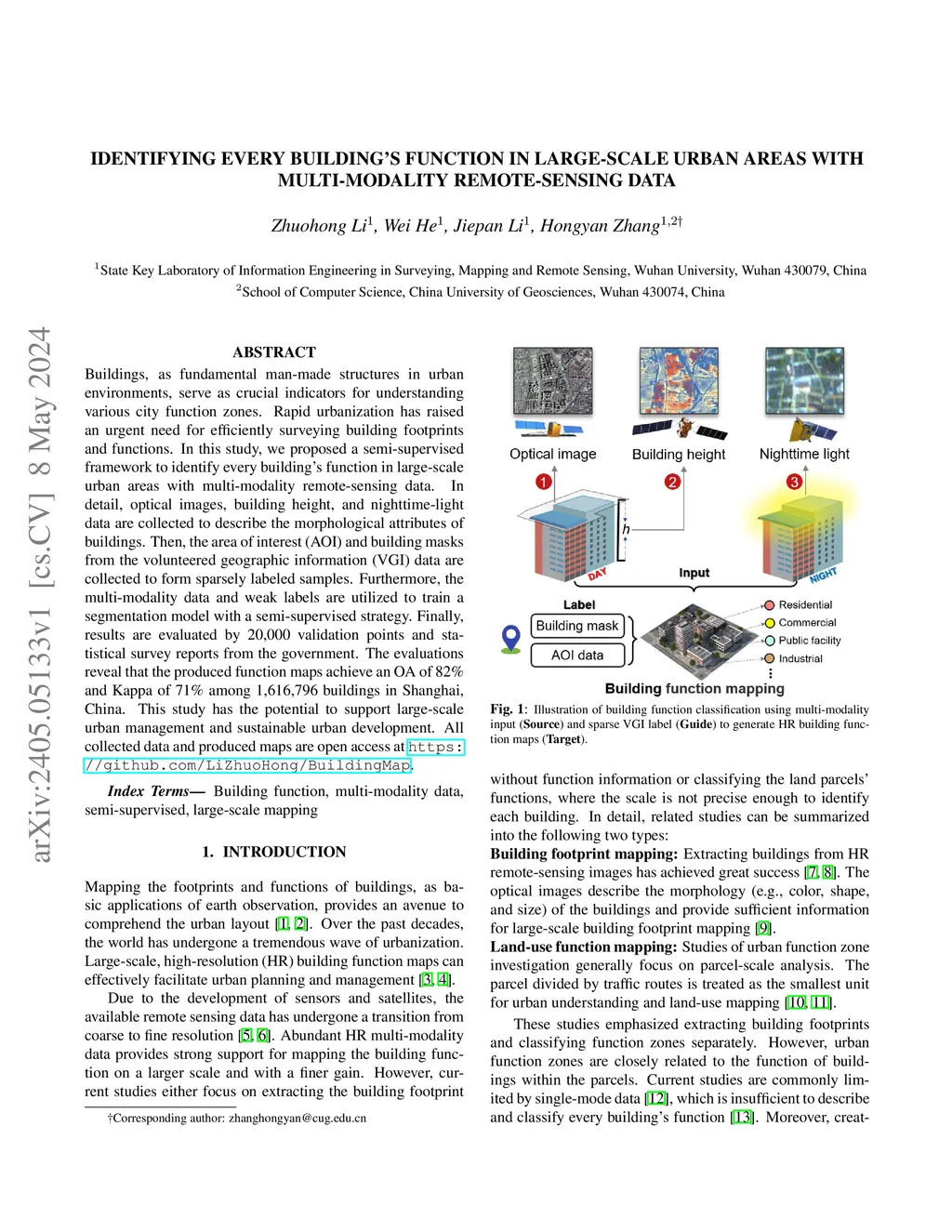Buildings, as fundamental man-made structures in urban environments, serve as crucial indicators for understanding various city function zones. Rapid urbanization has raised an urgent need for efficiently surveying building footprints and functions. In this study, we proposed a semi-supervised framework to identify every building's function in large-scale urban areas with multi-modality remote-sensing data. In detail, optical images, building height, and nighttime-light data are collected to describe the morphological attributes of buildings. Then, the area of interest (AOI) and building masks from the volunteered geographic information (VGI) data are collected to form sparsely labeled samples. Furthermore, the multi-modality data and weak labels are utilized to train a segmentation model with a semi-supervised strategy. Finally, results are evaluated by 20,000 validation points and statistical survey reports from the government. The evaluations reveal that the produced function maps achieve an OA of 82% and Kappa of 71% among 1,616,796 buildings in Shanghai, China. This study has the potential to support large-scale urban management and sustainable urban development. All collected data and produced maps are open access at https://github.com/LiZhuoHong/BuildingMap.
