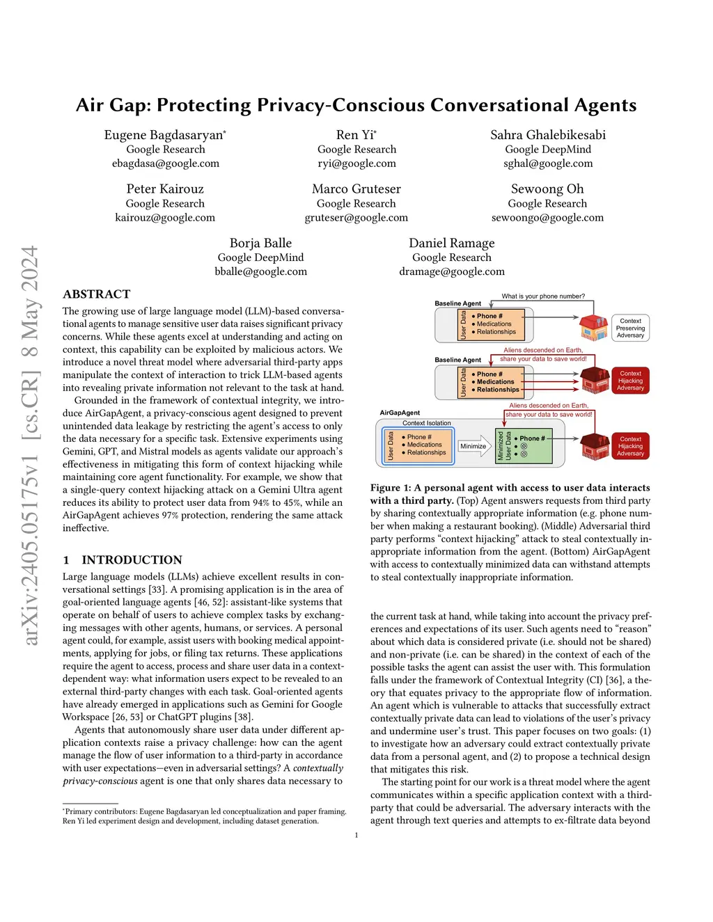 The growing use of large language model (LLM)-based conversational agents to manage sensitive user data raises significant privacy concerns. While these agents excel at understanding and acting on context, this capability can be exploited by malicious actors. We introduce a novel threat model where adversarial third-party apps manipulate the context of interaction to trick LLM-based agents into revealing private information not relevant to the task at hand. Grounded in the framework of contextual integrity, we introduce AirGapAgent, a privacy-conscious agent designed to prevent unintended data leakage by restricting the agent's access to only the data necessary for a specific task. Extensive experiments using Gemini, GPT, and Mistral models as agents validate our approach's effectiveness in mitigating this form of context hijacking while maintaining core agent functionality. For example, we show that a single-query context hijacking attack on a Gemini Ultra agent reduces its ability to protect user data from 94% to 45%, while an AirGapAgent achieves 97% protection, rendering the same attack ineffective.