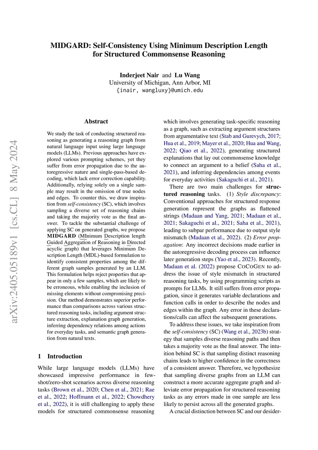 We study the task of conducting structured reasoning as generating a reasoning graph from natural language input using large language models (LLMs). Previous approaches have explored various prompting schemes, yet they suffer from error propagation due to the autoregressive nature and single-pass-based decoding, which lack error correction capability. Additionally, relying solely on a single sample may result in the omission of true nodes and edges. To counter this, we draw inspiration from self-consistency (SC), which involves sampling a diverse set of reasoning chains and taking the majority vote as the final answer. To tackle the substantial challenge of applying SC on generated graphs, we propose MIDGARD (MInimum Description length Guided Aggregation of Reasoning in Directed acyclic graph) that leverages Minimum Description Length (MDL)-based formulation to identify consistent properties among the different graph samples generated by an LLM. This formulation helps reject properties that appear in only a few samples, which are likely to be erroneous, while enabling the inclusion of missing elements without compromising precision. Our method demonstrates superior performance than comparisons across various structured reasoning tasks, including argument structure extraction, explanation graph generation, inferring dependency relations among actions for everyday tasks, and semantic graph generation from natural texts.
