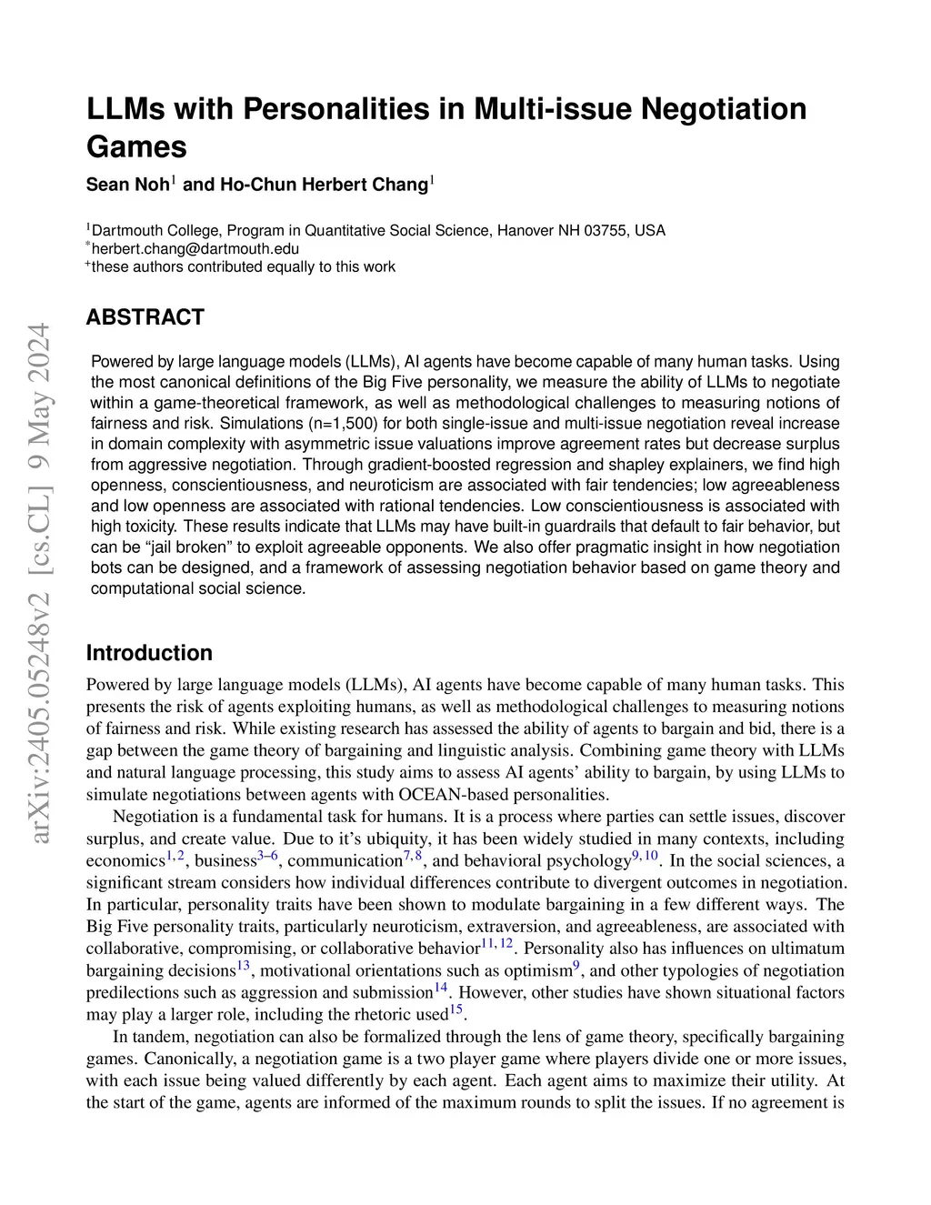 Powered by large language models (LLMs), AI agents have become capable of many human tasks. Using the most canonical definitions of the Big Five personality, we measure the ability of LLMs to negotiate within a game-theoretical framework, as well as methodological challenges to measuring notions of fairness and risk. Simulations (n=1,500) for both single-issue and multi-issue negotiation reveal increase in domain complexity with asymmetric issue valuations improve agreement rates but decrease surplus from aggressive negotiation. Through gradient-boosted regression and Shapley explainers, we find high openness, conscientiousness, and neuroticism are associated with fair tendencies; low agreeableness and low openness are associated with rational tendencies. Low conscientiousness is associated with high toxicity. These results indicate that LLMs may have built-in guardrails that default to fair behavior, but can be "jail broken" to exploit agreeable opponents. We also offer pragmatic insight in how negotiation bots can be designed, and a framework of assessing negotiation behavior based on game theory and computational social science.