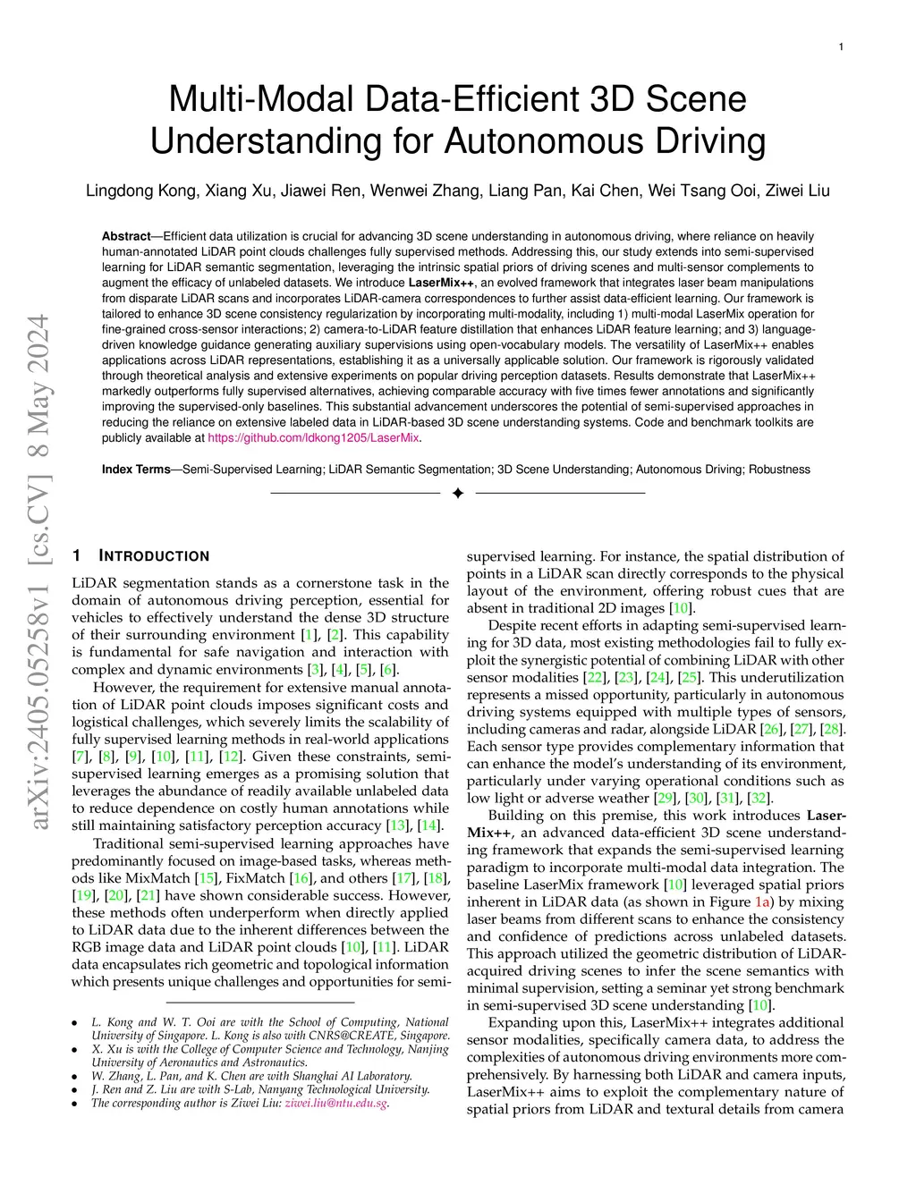 Efficient data utilization is crucial for advancing 3D scene understanding in autonomous driving, where reliance on heavily human-annotated LiDAR point clouds challenges fully supervised methods. Addressing this, our study extends into semi-supervised learning for LiDAR semantic segmentation, leveraging the intrinsic spatial priors of driving scenes and multi-sensor complements to augment the efficacy of unlabeled datasets. We introduce LaserMix++, an evolved framework that integrates laser beam manipulations from disparate LiDAR scans and incorporates LiDAR-camera correspondences to further assist data-efficient learning. Our framework is tailored to enhance 3D scene consistency regularization by incorporating multi-modality, including 1) multi-modal LaserMix operation for fine-grained cross-sensor interactions; 2) camera-to-LiDAR feature distillation that enhances LiDAR feature learning; and 3) language-driven knowledge guidance generating auxiliary supervisions using open-vocabulary models. The versatility of LaserMix++ enables applications across LiDAR representations, establishing it as a universally applicable solution. Our framework is rigorously validated through theoretical analysis and extensive experiments on popular driving perception datasets. Results demonstrate that LaserMix++ markedly outperforms fully supervised alternatives, achieving comparable accuracy with five times fewer annotations and significantly improving the supervised-only baselines. This substantial advancement underscores the potential of semi-supervised approaches in reducing the reliance on extensive labeled data in LiDAR-based 3D scene understanding systems.