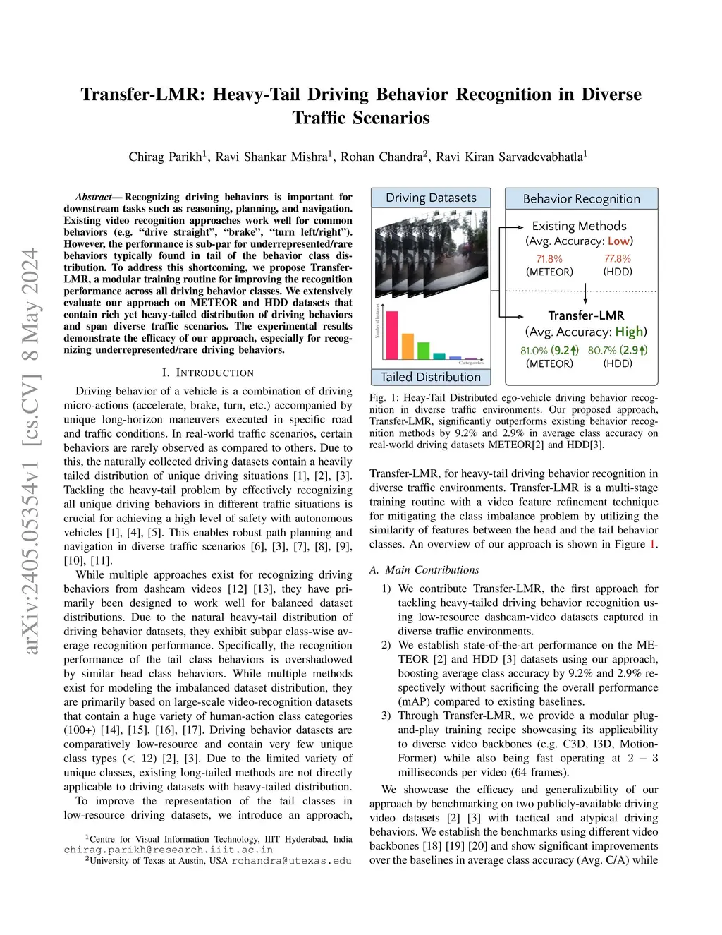 Recognizing driving behaviors is important for downstream tasks such as reasoning, planning, and navigation. Existing video recognition approaches work well for common behaviors (e.g. "drive straight", "brake", "turn left/right"). However, the performance is sub-par for underrepresented/rare behaviors typically found in tail of the behavior class distribution. To address this shortcoming, we propose Transfer-LMR, a modular training routine for improving the recognition performance across all driving behavior classes. We extensively evaluate our approach on METEOR and HDD datasets that contain rich yet heavy-tailed distribution of driving behaviors and span diverse traffic scenarios. The experimental results demonstrate the efficacy of our approach, especially for recognizing underrepresented/rare driving behaviors.