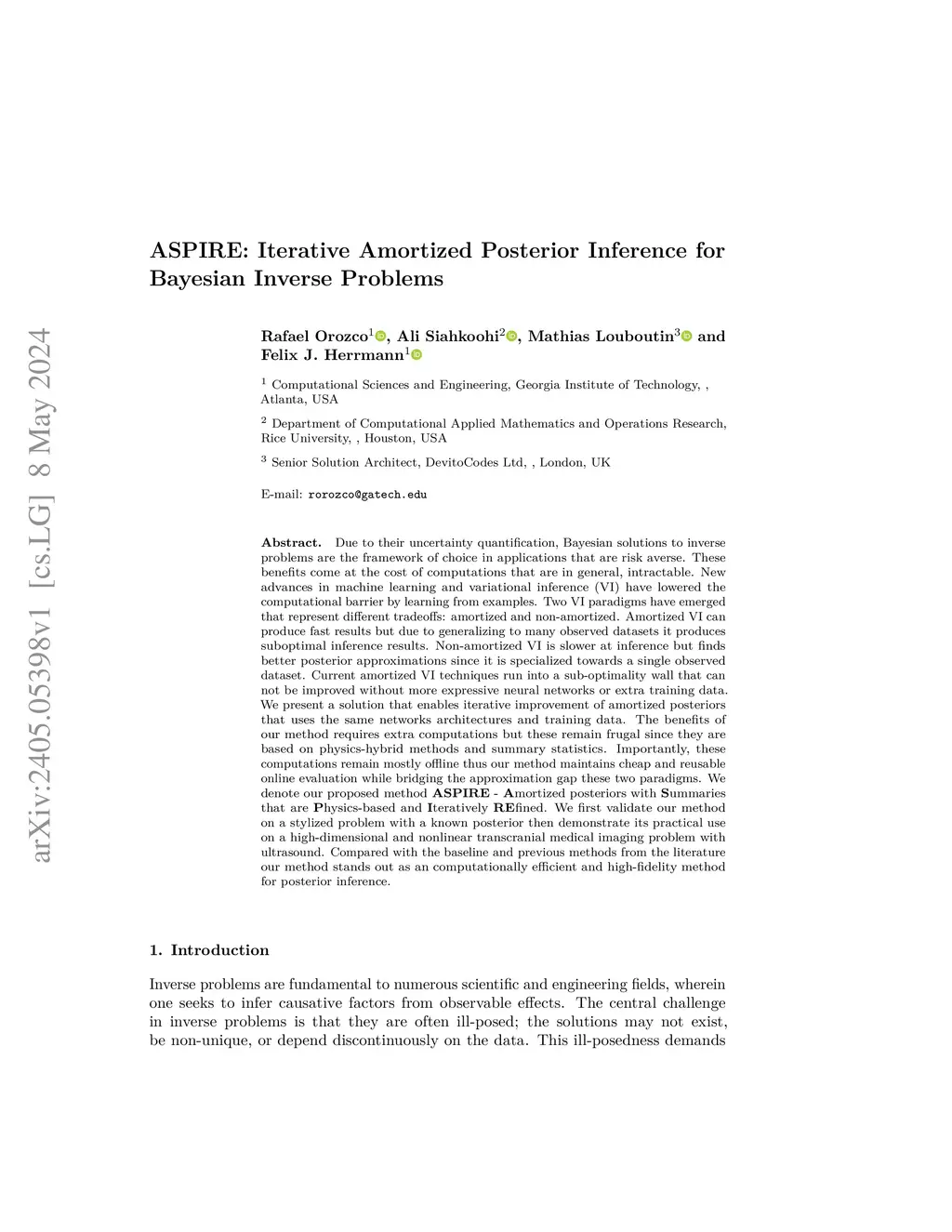 Due to their uncertainty quantification, Bayesian solutions to inverse problems are the framework of choice in applications that are risk averse. These benefits come at the cost of computations that are in general, intractable. New advances in machine learning and variational inference (VI) have lowered the computational barrier by learning from examples. Two VI paradigms have emerged that represent different tradeoffs: amortized and non-amortized. Amortized VI can produce fast results but due to generalizing to many observed datasets it produces suboptimal inference results. Non-amortized VI is slower at inference but finds better posterior approximations since it is specialized towards a single observed dataset. Current amortized VI techniques run into a sub-optimality wall that can not be improved without more expressive neural networks or extra training data. We present a solution that enables iterative improvement of amortized posteriors that uses the same networks architectures and training data. The benefits of our method requires extra computations but these remain frugal since they are based on physics-hybrid methods and summary statistics. Importantly, these computations remain mostly offline thus our method maintains cheap and reusable online evaluation while bridging the approximation gap these two paradigms. We denote our proposed method ASPIRE - Amortized posteriors with Summaries that are Physics-based and Iteratively REfined. We first validate our method on a stylized problem with a known posterior then demonstrate its practical use on a high-dimensional and nonlinear transcranial medical imaging problem with ultrasound. Compared with the baseline and previous methods from the literature our method stands out as an computationally efficient and high-fidelity method for posterior inference.