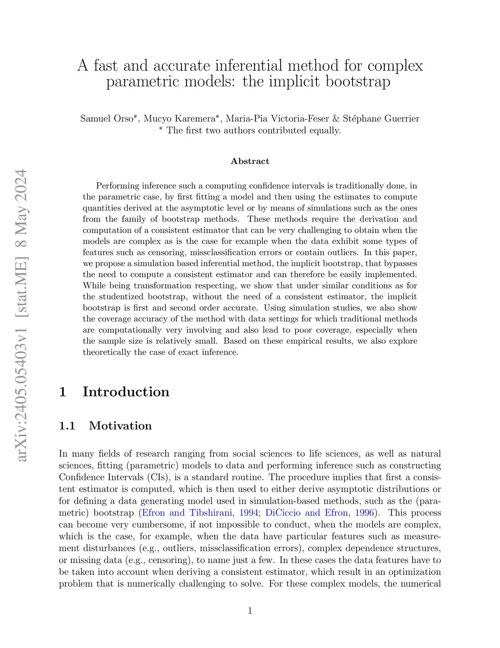 Performing inference such a computing confidence intervals is traditionally done, in the parametric case, by first fitting a model and then using the estimates to compute quantities derived at the asymptotic level or by means of simulations such as the ones from the family of bootstrap methods. These methods require the derivation and computation of a consistent estimator that can be very challenging to obtain when the models are complex as is the case for example when the data exhibit some types of features such as censoring, missclassification errors or contain outliers. In this paper, we propose a simulation based inferential method, the implicit bootstrap, that bypasses the need to compute a consistent estimator and can therefore be easily implemented. While being transformation respecting, we show that under similar conditions as for the studentized bootstrap, without the need of a consistent estimator, the implicit bootstrap is first and second order accurate. Using simulation studies, we also show the coverage accuracy of the method with data settings for which traditional methods are computationally very involving and also lead to poor coverage, especially when the sample size is relatively small. Based on these empirical results, we also explore theoretically the case of exact inference.