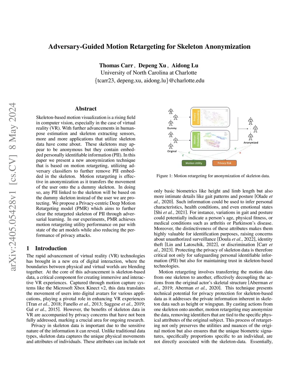 Skeleton-based motion visualization is a rising field in computer vision, especially in the case of virtual reality (VR). With further advancements in human-pose estimation and skeleton extracting sensors, more and more applications that utilize skeleton data have come about. These skeletons may appear to be anonymous but they contain embedded personally identifiable information (PII). In this paper we present a new anonymization technique that is based on motion retargeting, utilizing adversary classifiers to further remove PII embedded in the skeleton. Motion retargeting is effective in anonymization as it transfers the movement of the user onto the a dummy skeleton. In doing so, any PII linked to the skeleton will be based on the dummy skeleton instead of the user we are protecting. We propose a Privacy-centric Deep Motion Retargeting model (PMR) which aims to further clear the retargeted skeleton of PII through adversarial learning. In our experiments, PMR achieves motion retargeting utility performance on par with state of the art models while also reducing the performance of privacy attacks.