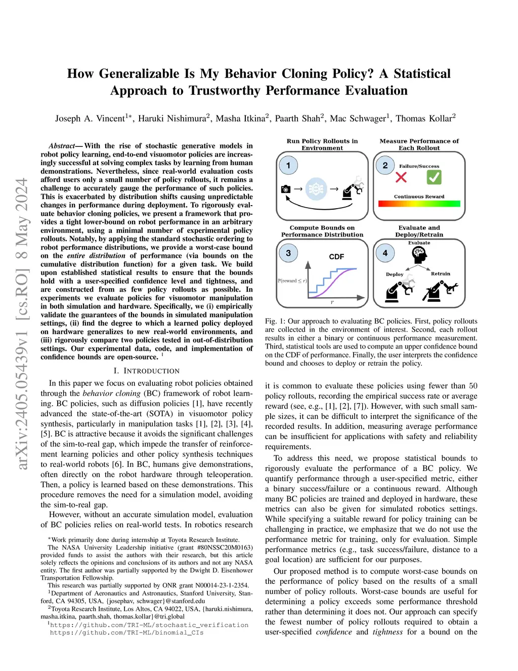 With the rise of stochastic generative models in robot policy learning, end-to-end visuomotor policies are increasingly successful at solving complex tasks by learning from human demonstrations. Nevertheless, since real-world evaluation costs afford users only a small number of policy rollouts, it remains a challenge to accurately gauge the performance of such policies. This is exacerbated by distribution shifts causing unpredictable changes in performance during deployment. To rigorously evaluate behavior cloning policies, we present a framework that provides a tight lower-bound on robot performance in an arbitrary environment, using a minimal number of experimental policy rollouts. Notably, by applying the standard stochastic ordering to robot performance distributions, we provide a worst-case bound on the entire distribution of performance (via bounds on the cumulative distribution function) for a given task. We build upon established statistical results to ensure that the bounds hold with a user-specified confidence level and tightness, and are constructed from as few policy rollouts as possible. In experiments we evaluate policies for visuomotor manipulation in both simulation and hardware. Specifically, we (i) empirically validate the guarantees of the bounds in simulated manipulation settings, (ii) find the degree to which a learned policy deployed on hardware generalizes to new real-world environments, and (iii) rigorously compare two policies tested in out-of-distribution settings. Our experimental data, code, and implementation of confidence bounds are open-source.