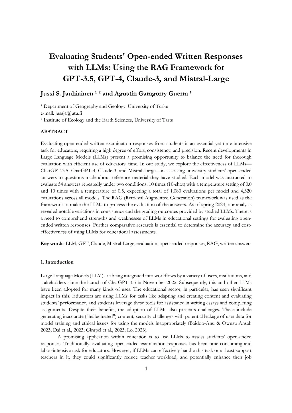 Evaluating open-ended written examination responses from students is an essential yet time-intensive task for educators, requiring a high degree of effort, consistency, and precision. Recent developments in Large Language Models (LLMs) present a promising opportunity to balance the need for thorough evaluation with efficient use of educators' time. In our study, we explore the effectiveness of LLMs ChatGPT-3.5, ChatGPT-4, Claude-3, and Mistral-Large in assessing university students' open-ended answers to questions made about reference material they have studied. Each model was instructed to evaluate 54 answers repeatedly under two conditions: 10 times (10-shot) with a temperature setting of 0.0 and 10 times with a temperature of 0.5, expecting a total of 1,080 evaluations per model and 4,320 evaluations across all models. The RAG (Retrieval Augmented Generation) framework was used as the framework to make the LLMs to process the evaluation of the answers. As of spring 2024, our analysis revealed notable variations in consistency and the grading outcomes provided by studied LLMs. There is a need to comprehend strengths and weaknesses of LLMs in educational settings for evaluating open-ended written responses. Further comparative research is essential to determine the accuracy and cost-effectiveness of using LLMs for educational assessments.