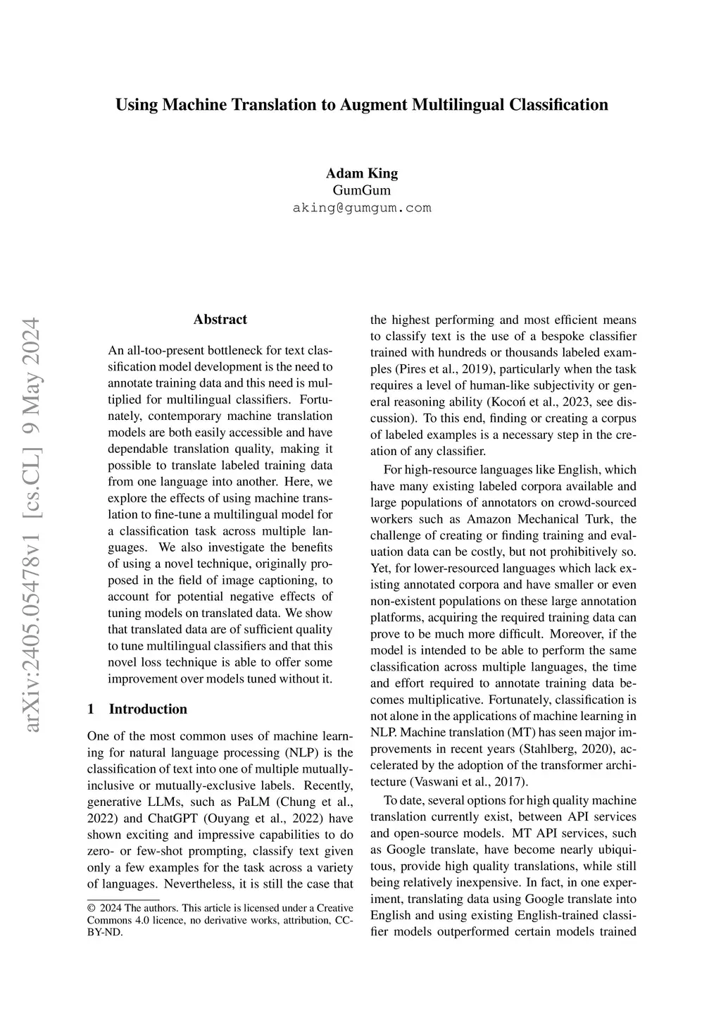 An all-too-present bottleneck for text classification model development is the need to annotate training data and this need is multiplied for multilingual classifiers. Fortunately, contemporary machine translation models are both easily accessible and have dependable translation quality, making it possible to translate labeled training data from one language into another. Here, we explore the effects of using machine translation to fine-tune a multilingual model for a classification task across multiple languages. We also investigate the benefits of using a novel technique, originally proposed in the field of image captioning, to account for potential negative effects of tuning models on translated data. We show that translated data are of sufficient quality to tune multilingual classifiers and that this novel loss technique is able to offer some improvement over models tuned without it.