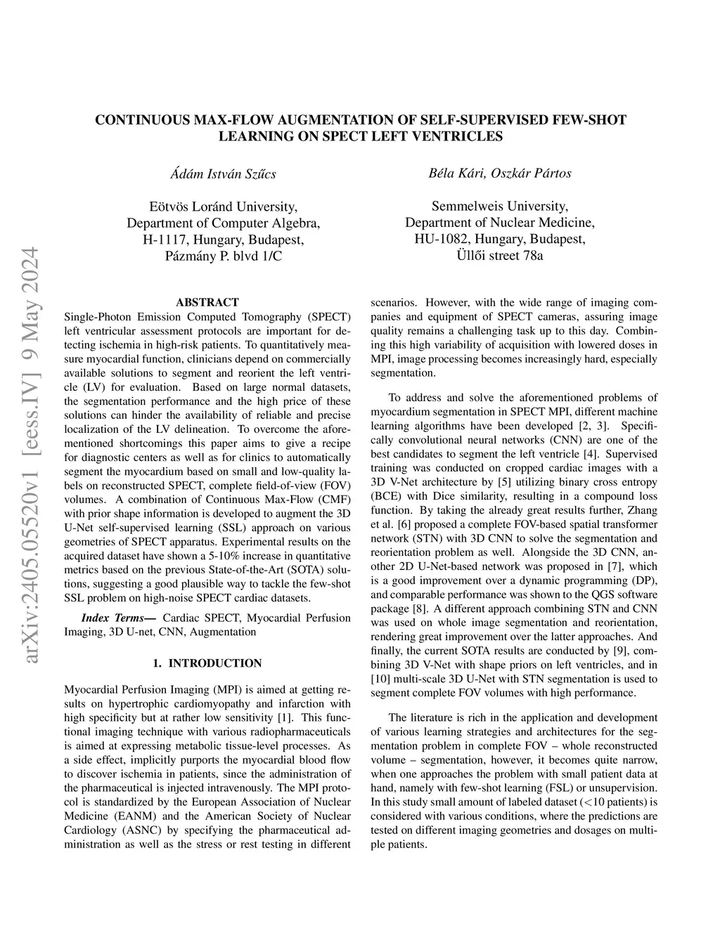 Single-Photon Emission Computed Tomography (SPECT) left ventricular assessment protocols are important for detecting ischemia in high-risk patients. To quantitatively measure myocardial function, clinicians depend on commercially available solutions to segment and reorient the left ventricle (LV) for evaluation. Based on large normal datasets, the segmentation performance and the high price of these solutions can hinder the availability of reliable and precise localization of the LV delineation. To overcome the aforementioned shortcomings this paper aims to give a recipe for diagnostic centers as well as for clinics to automatically segment the myocardium based on small and low-quality labels on reconstructed SPECT, complete field-of-view (FOV) volumes. A combination of Continuous Max-Flow (CMF) with prior shape information is developed to augment the 3D U-Net self-supervised learning (SSL) approach on various geometries of SPECT apparatus. Experimental results on the acquired dataset have shown a 5-10\% increase in quantitative metrics based on the previous State-of-the-Art (SOTA) solutions, suggesting a good plausible way to tackle the few-shot SSL problem on high-noise SPECT cardiac datasets.