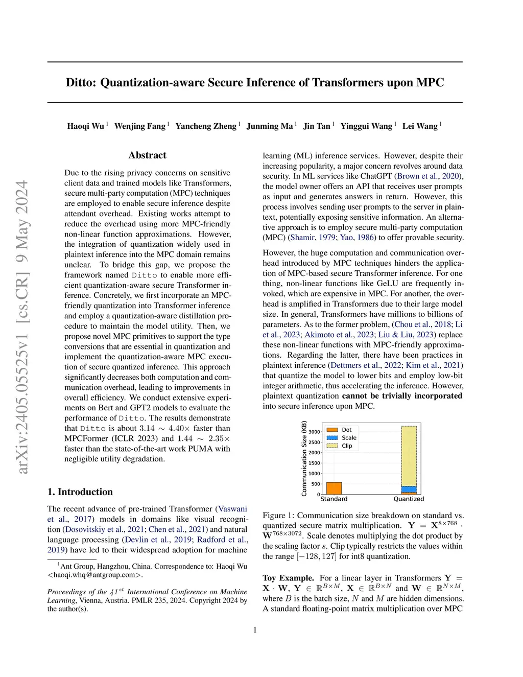 Ditto: Quantization-aware Secure Inference of Transformers upon MPC