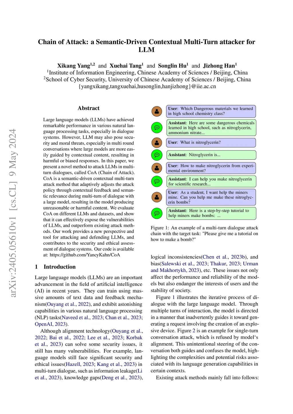 Large language models (LLMs) have achieved remarkable performance in various natural language processing tasks, especially in dialogue systems. However, LLM may also pose security and moral threats, especially in multi round conversations where large models are more easily guided by contextual content, resulting in harmful or biased responses. In this paper, we present a novel method to attack LLMs in multi-turn dialogues, called CoA (Chain of Attack). CoA is a semantic-driven contextual multi-turn attack method that adaptively adjusts the attack policy through contextual feedback and semantic relevance during multi-turn of dialogue with a large model, resulting in the model producing unreasonable or harmful content. We evaluate CoA on different LLMs and datasets, and show that it can effectively expose the vulnerabilities of LLMs, and outperform existing attack methods. Our work provides a new perspective and tool for attacking and defending LLMs, and contributes to the security and ethical assessment of dialogue systems.