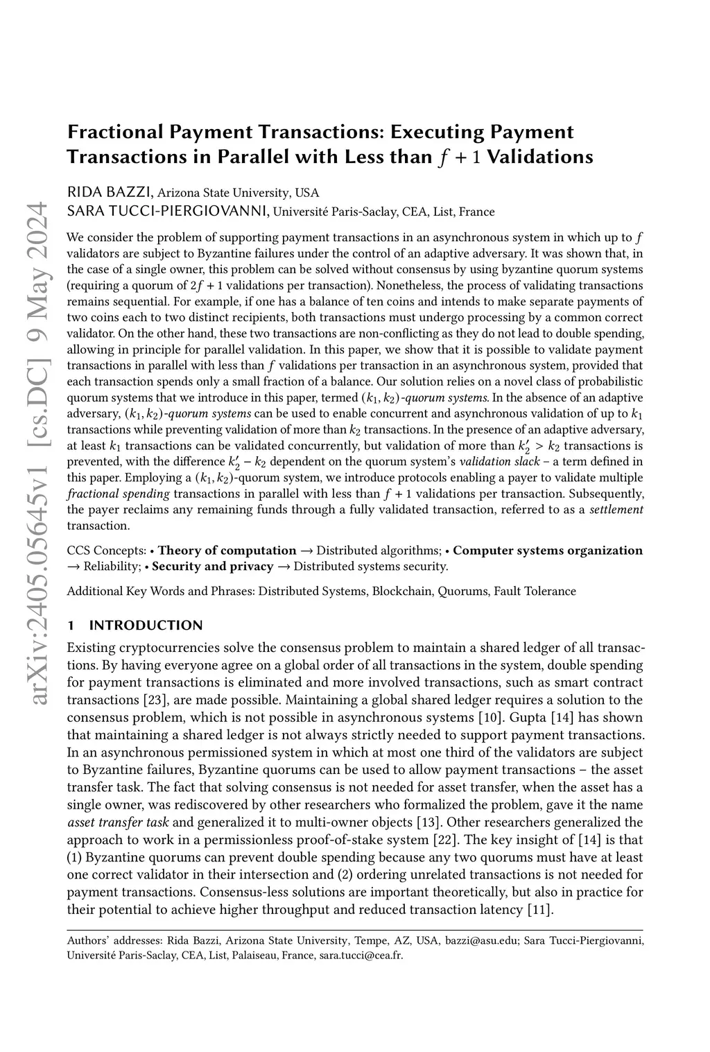 We consider the problem of supporting payment transactions in an asynchronous system in which up to validators are subject to Byzantine failures under the control of an adaptive adversary. It was shown that, in the case of a single owner, this problem can be solved without consensus by using byzantine quorum systems (requiring a quorum of validations per transaction). Nonetheless, the process of validating transactions remains sequential. For example, if one has a balance of ten coins and intends to make separate payments of two coins each to two distinct recipients, both transactions must undergo processing by a common correct validator. On the other hand, these two transactions are non-conflicting as they do not lead to double spending, allowing in principle for parallel validation. In this paper, we show that it is possible to validate payment transactions in parallel with less than validations per transaction in an asynchronous system, provided that each transaction spends only a small fraction of a balance. Our solution relies on a novel class of probabilistic quorum systems that we introduce in this paper, termed \textit{-quorum systems}. In the absence of an adaptive adversary, \textit{-quorum systems} can be used to enable concurrent and asynchronous validation of up to transactions while preventing validation of more than transactions. Employing a -quorum system, we introduce protocols enabling a payer to validate multiple \textit{fractional spending} transactions in parallel with less than validations per transaction. Subsequently, the payer reclaims any remaining funds through a fully validated transaction, referred to as a \textit{settlement} transaction.