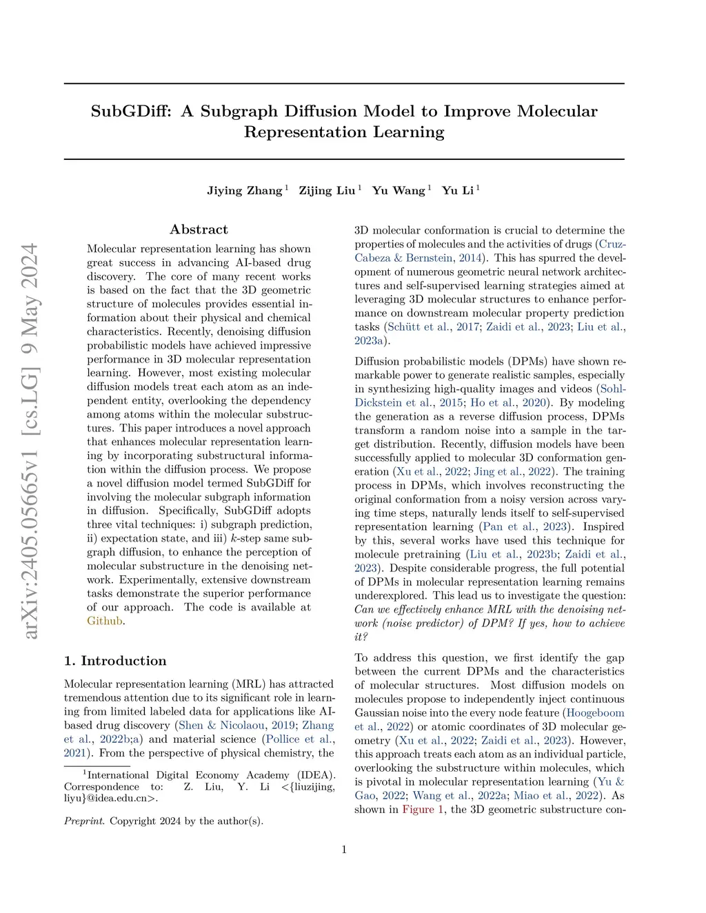 SubGDiff: A Subgraph Diffusion Model to Improve Molecular Representation