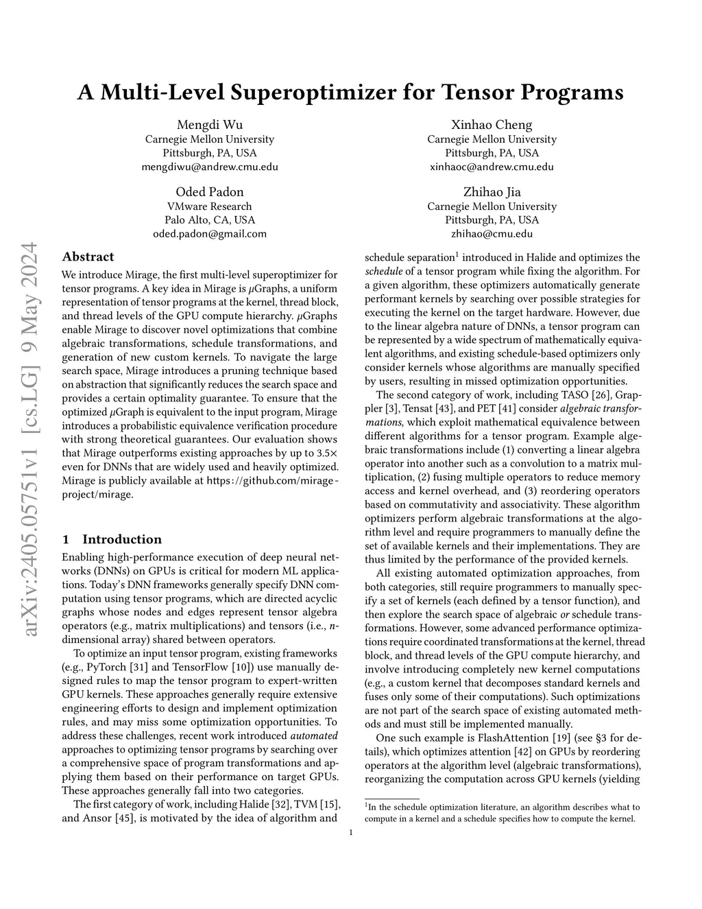 We introduce Mirage, the first multi-level superoptimizer for tensor programs. A key idea in Mirage is Graphs, a uniform representation of tensor programs at the kernel, thread block, and thread levels of the GPU compute hierarchy. Graphs enable Mirage to discover novel optimizations that combine algebraic transformations, schedule transformations, and generation of new custom kernels. To navigate the large search space, Mirage introduces a pruning technique based on abstraction that significantly reduces the search space and provides a certain optimality guarantee. To ensure that the optimized Graph is equivalent to the input program, Mirage introduces a probabilistic equivalence verification procedure with strong theoretical guarantees. Our evaluation shows that Mirage outperforms existing approaches by up to 3.3 even for DNNs that are widely used and heavily optimized. Mirage is publicly available atthis https URL.