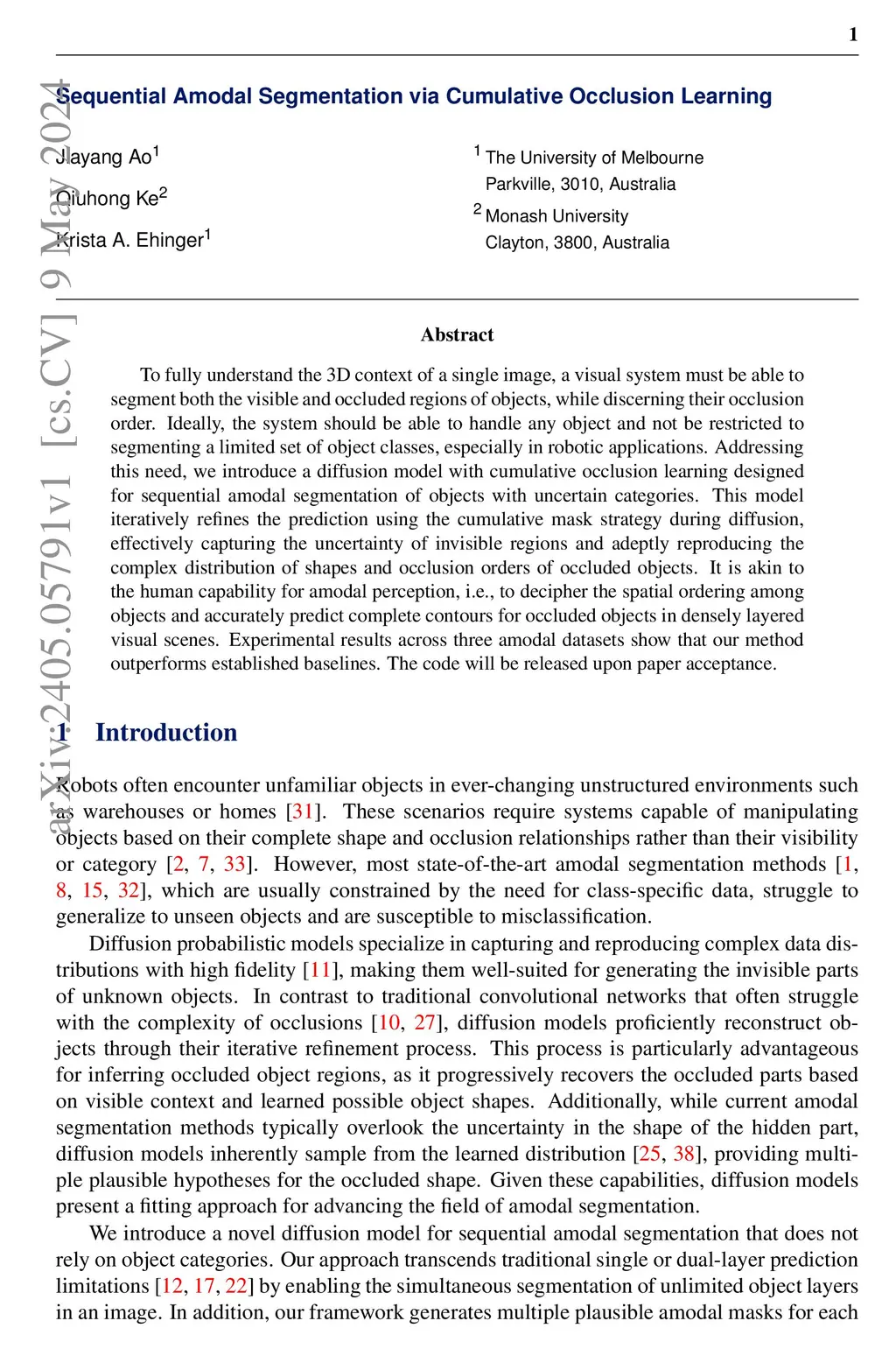 To fully understand the 3D context of a single image, a visual system must be able to segment both the visible and occluded regions of objects, while discerning their occlusion order. Ideally, the system should be able to handle any object and not be restricted to segmenting a limited set of object classes, especially in robotic applications. Addressing this need, we introduce a diffusion model with cumulative occlusion learning designed for sequential amodal segmentation of objects with uncertain categories. This model iteratively refines the prediction using the cumulative mask strategy during diffusion, effectively capturing the uncertainty of invisible regions and adeptly reproducing the complex distribution of shapes and occlusion orders of occluded objects. It is akin to the human capability for amodal perception, i.e., to decipher the spatial ordering among objects and accurately predict complete contours for occluded objects in densely layered visual scenes. Experimental results across three amodal datasets show that our method outperforms established baselines.
