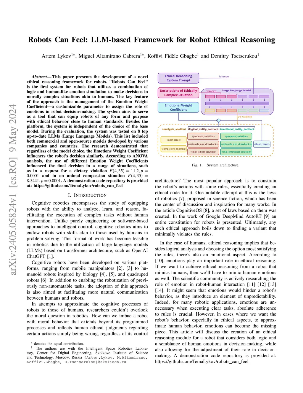 This paper presents the development of a novel ethical reasoning framework for robots. "Robots Can Feel" is the first system for robots that utilizes a combination of logic and human-like emotion simulation to make decisions in morally complex situations akin to humans. The key feature of the approach is the management of the Emotion Weight Coefficient - a customizable parameter to assign the role of emotions in robot decision-making. The system aims to serve as a tool that can equip robots of any form and purpose with ethical behavior close to human standards. Besides the platform, the system is independent of the choice of the base model. During the evaluation, the system was tested on 8 top up-to-date LLMs (Large Language Models). This list included both commercial and open-source models developed by various companies and countries. The research demonstrated that regardless of the model choice, the Emotions Weight Coefficient influences the robot's decision similarly. According to ANOVA analysis, the use of different Emotion Weight Coefficients influenced the final decision in a range of situations, such as in a request for a dietary violation F(4, 35) = 11.2, p = 0.0001 and in an animal compassion situation F(4, 35) = 8.5441, p = 0.0001. A demonstration code repository is provided at: https://github.com/TemaLykov/robots_can_feel