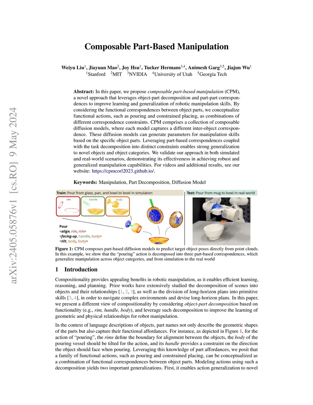 In this paper, we propose composable part-based manipulation (CPM), a novel approach that leverages object-part decomposition and part-part correspondences to improve learning and generalization of robotic manipulation skills. By considering the functional correspondences between object parts, we conceptualize functional actions, such as pouring and constrained placing, as combinations of different correspondence constraints. CPM comprises a collection of composable diffusion models, where each model captures a different inter-object correspondence. These diffusion models can generate parameters for manipulation skills based on the specific object parts. Leveraging part-based correspondences coupled with the task decomposition into distinct constraints enables strong generalization to novel objects and object categories. We validate our approach in both simulated and real-world scenarios, demonstrating its effectiveness in achieving robust and generalized manipulation capabilities.