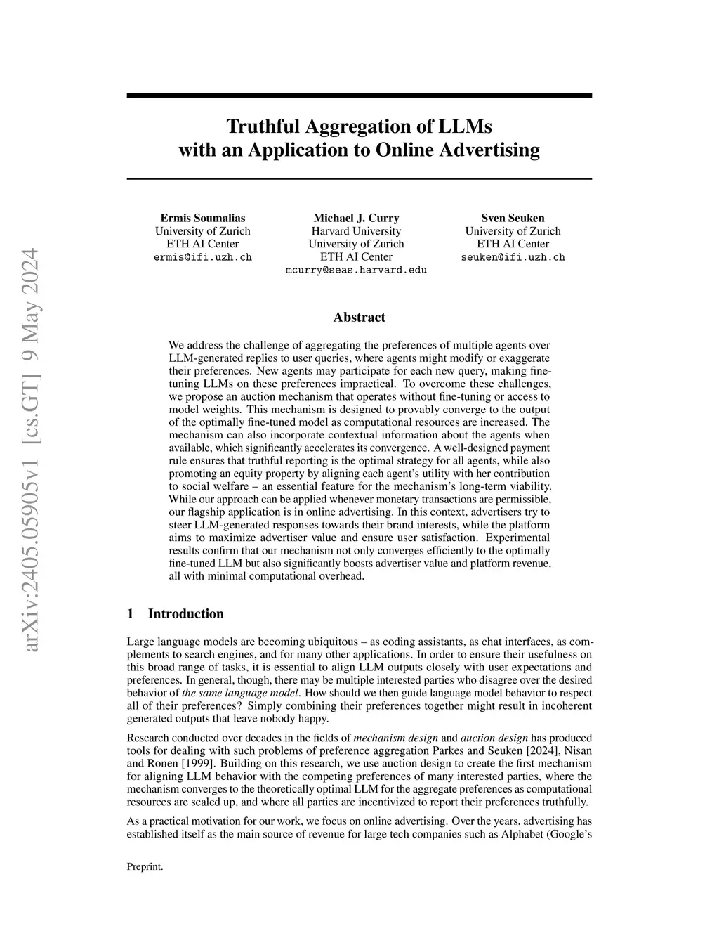 The next frontier of online advertising is revenue generation from LLM-generated content. We consider a setting where advertisers aim to influence the responses of an LLM to align with their interests, while platforms seek to maximize advertiser value and ensure user satisfaction. The challenge is that advertisers' preferences generally conflict with those of the user, and advertisers may misreport their preferences. To address this, we introduce MOSAIC, an auction mechanism that ensures that truthful reporting is a dominant strategy for advertisers and that aligns the utility of each advertiser with their contribution to social welfare. Importantly, the mechanism operates without LLM fine-tuning or access to model weights and provably converges to the output of the optimally fine-tuned LLM as computational resources increase. Additionally, it can incorporate contextual information about advertisers, which significantly improves social welfare. Through experiments with a publicly available LLM, we show that MOSAIC leads to high advertiser value and platform revenue with low computational overhead. While our motivating application is online advertising, our mechanism can be applied in any setting with monetary transfers, making it a general-purpose solution for truthfully aggregating the preferences of self-interested agents over LLM-generated replies.