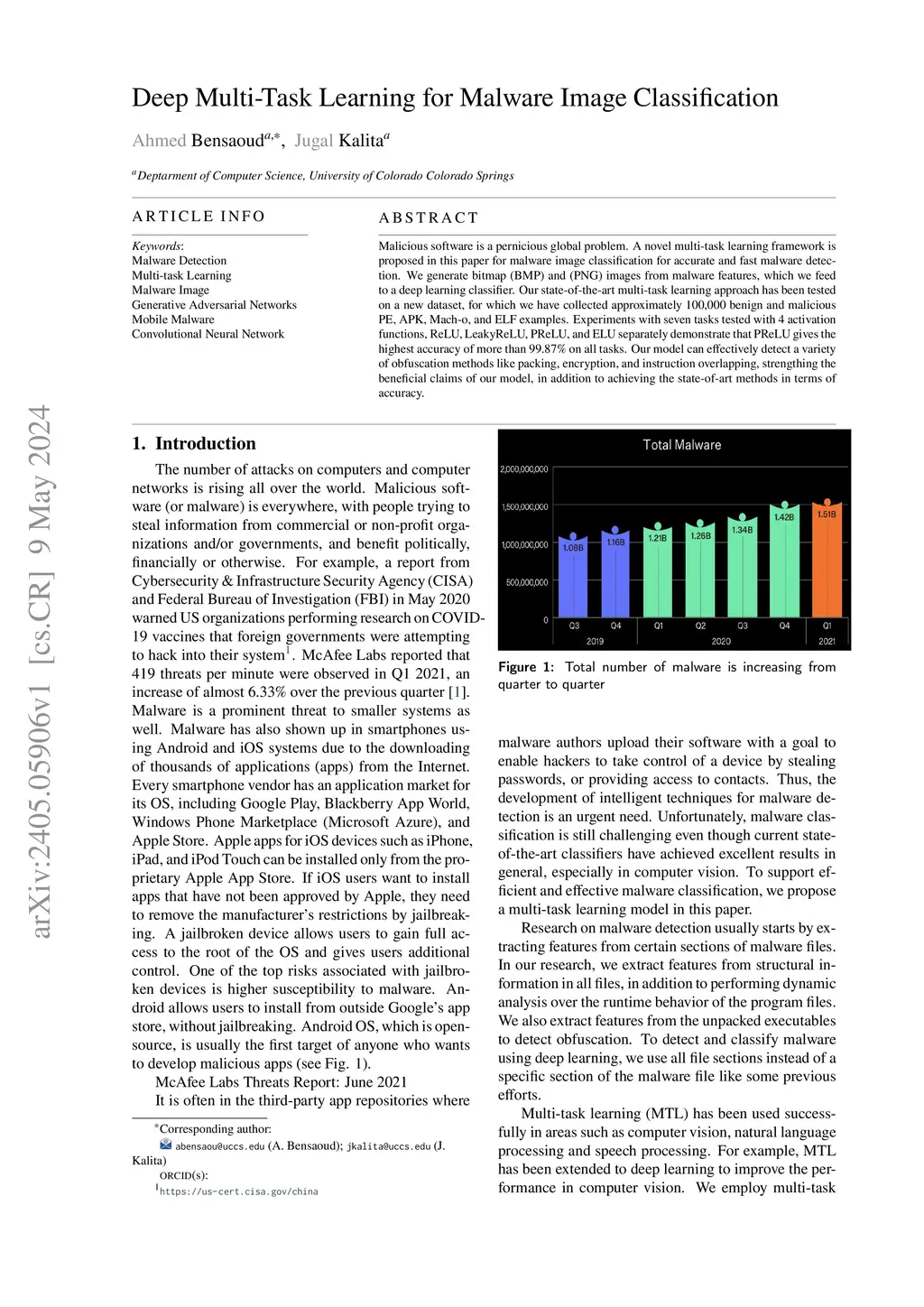 Malicious software is a pernicious global problem. A novel multi-task learning framework is proposed in this paper for malware image classification for accurate and fast malware detection. We generate bitmap (BMP) and (PNG) images from malware features, which we feed to a deep learning classifier. Our state-of-the-art multi-task learning approach has been tested on a new dataset, for which we have collected approximately 100,000 benign and malicious PE, APK, Mach-o, and ELF examples. Experiments with seven tasks tested with 4 activation functions, ReLU, LeakyReLU, PReLU, and ELU separately demonstrate that PReLU gives the highest accuracy of more than 99.87% on all tasks. Our model can effectively detect a variety of obfuscation methods like packing, encryption, and instruction overlapping, strengthing the beneficial claims of our model, in addition to achieving the state-of-art methods in terms of accuracy.