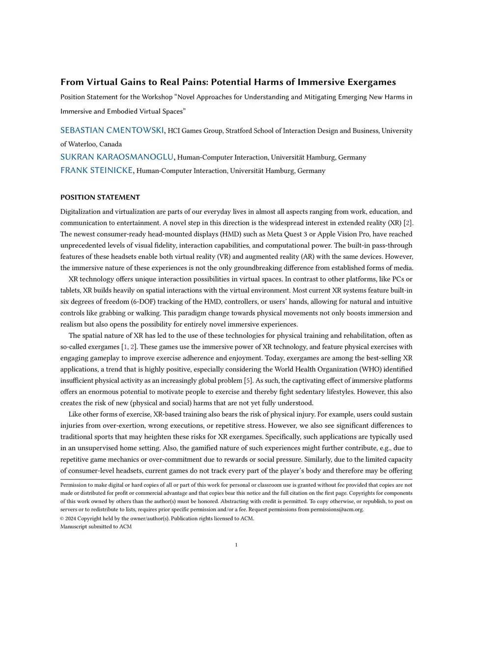 Digitalization and virtualization are parts of our everyday lives in almost all aspects ranging from work, education, and communication to entertainment. A novel step in this direction is the widespread interest in extended reality (XR) [2]. The newest consumer-ready head-mounted displays (HMD) such as Meta Quest 3 or Apple Vision Pro, have reached unprecedented levels of visual fidelity, interaction capabilities, and computational power. The built-in pass-through features of these headsets enable both virtual reality (VR) and augmented reality (AR) with the same devices. However, the immersive nature of these experiences is not the only groundbreaking difference from established forms of media.