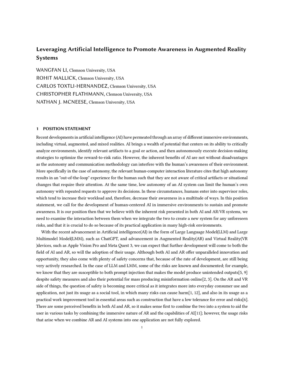 Recent developments in artificial intelligence (AI) have permeated through an array of different immersive environments, including virtual, augmented, and mixed realities. AI brings a wealth of potential that centers on its ability to critically analyze environments, identify relevant artifacts to a goal or action, and then autonomously execute decision-making strategies to optimize the reward-to-risk ratio. However, the inherent benefits of AI are not without disadvantages as the autonomy and communication methodology can interfere with the human's awareness of their environment. More specifically in the case of autonomy, the relevant human-computer interaction literature cites that high autonomy results in an "out-of-the-loop" experience for the human such that they are not aware of critical artifacts or situational changes that require their attention. At the same time, low autonomy of an AI system can limit the human's own autonomy with repeated requests to approve its decisions. In these circumstances, humans enter into supervisor roles, which tend to increase their workload and, therefore, decrease their awareness in a multitude of ways. In this position statement, we call for the development of human-centered AI in immersive environments to sustain and promote awareness. It is our position then that we believe with the inherent risk presented in both AI and AR/VR systems, we need to examine the interaction between them when we integrate the two to create a new system for any unforeseen risks, and that it is crucial to do so because of its practical application in many high-risk environments.