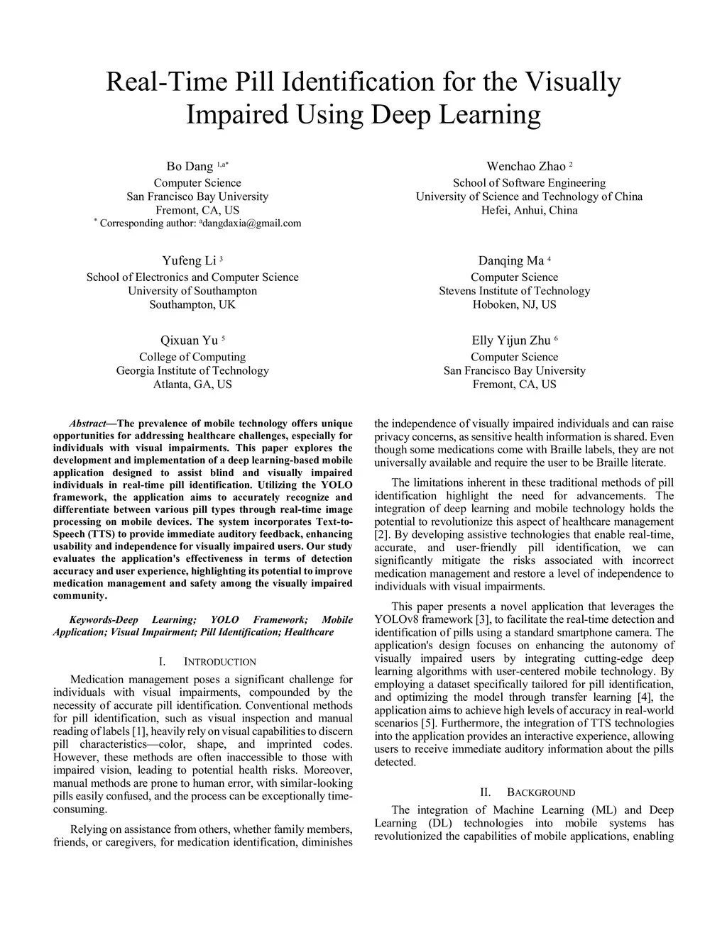 The prevalence of mobile technology offers unique opportunities for addressing healthcare challenges, especially for individuals with visual impairments. This paper explores the development and implementation of a deep learning-based mobile application designed to assist blind and visually impaired individuals in real-time pill identification. Utilizing the YOLO framework, the application aims to accurately recognize and differentiate between various pill types through real-time image processing on mobile devices. The system incorporates Text-to- Speech (TTS) to provide immediate auditory feedback, enhancing usability and independence for visually impaired users. Our study evaluates the application's effectiveness in terms of detection accuracy and user experience, highlighting its potential to improve medication management and safety among the visually impaired community. Keywords-Deep Learning; YOLO Framework; Mobile Application; Visual Impairment; Pill Identification; Healthcare