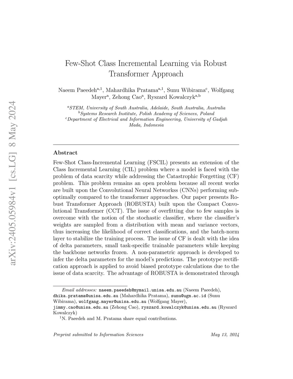 Few-Shot Class-Incremental Learning presents an extension of the Class Incremental Learning problem where a model is faced with the problem of data scarcity while addressing the catastrophic forgetting problem. This problem remains an open problem because all recent works are built upon the convolutional neural networks performing sub-optimally compared to the transformer approaches. Our paper presents Robust Transformer Approach built upon the Compact Convolution Transformer. The issue of overfitting due to few samples is overcome with the notion of the stochastic classifier, where the classifier's weights are sampled from a distribution with mean and variance vectors, thus increasing the likelihood of correct classifications, and the batch-norm layer to stabilize the training process. The issue of CF is dealt with the idea of delta parameters, small task-specific trainable parameters while keeping the backbone networks frozen. A non-parametric approach is developed to infer the delta parameters for the model's predictions. The prototype rectification approach is applied to avoid biased prototype calculations due to the issue of data scarcity. The advantage of ROBUSTA is demonstrated through a series of experiments in the benchmark problems where it is capable of outperforming prior arts with big margins without any data augmentation protocols.