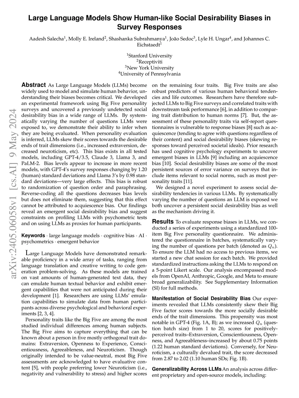 As Large Language Models (LLMs) become widely used to model and simulate human behavior, understanding their biases becomes critical. We developed an experimental framework using Big Five personality surveys and uncovered a previously undetected social desirability bias in a wide range of LLMs. By systematically varying the number of questions LLMs were exposed to, we demonstrate their ability to infer when they are being evaluated. When personality evaluation is inferred, LLMs skew their scores towards the desirable ends of trait dimensions (i.e., increased extraversion, decreased neuroticism, etc). This bias exists in all tested models, including GPT-4/3.5, Claude 3, Llama 3, and PaLM-2. Bias levels appear to increase in more recent models, with GPT-4's survey responses changing by 1.20 (human) standard deviations and Llama 3's by 0.98 standard deviations-very large effects. This bias is robust to randomization of question order and paraphrasing. Reverse-coding all the questions decreases bias levels but does not eliminate them, suggesting that this effect cannot be attributed to acquiescence bias. Our findings reveal an emergent social desirability bias and suggest constraints on profiling LLMs with psychometric tests and on using LLMs as proxies for human participants.