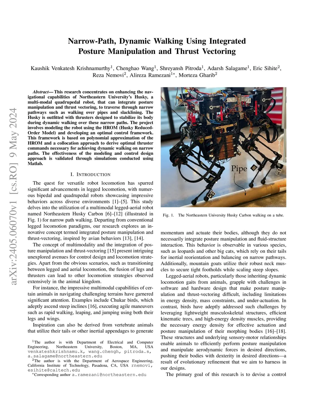 This research concentrates on enhancing the navigational capabilities of Northeastern Universitys Husky, a multi-modal quadrupedal robot, that can integrate posture manipulation and thrust vectoring, to traverse through narrow pathways such as walking over pipes and slacklining. The Husky is outfitted with thrusters designed to stabilize its body during dynamic walking over these narrow paths. The project involves modeling the robot using the HROM (Husky Reduced Order Model) and developing an optimal control framework. This framework is based on polynomial approximation of the HROM and a collocation approach to derive optimal thruster commands necessary for achieving dynamic walking on narrow paths. The effectiveness of the modeling and control design approach is validated through simulations conducted using Matlab.