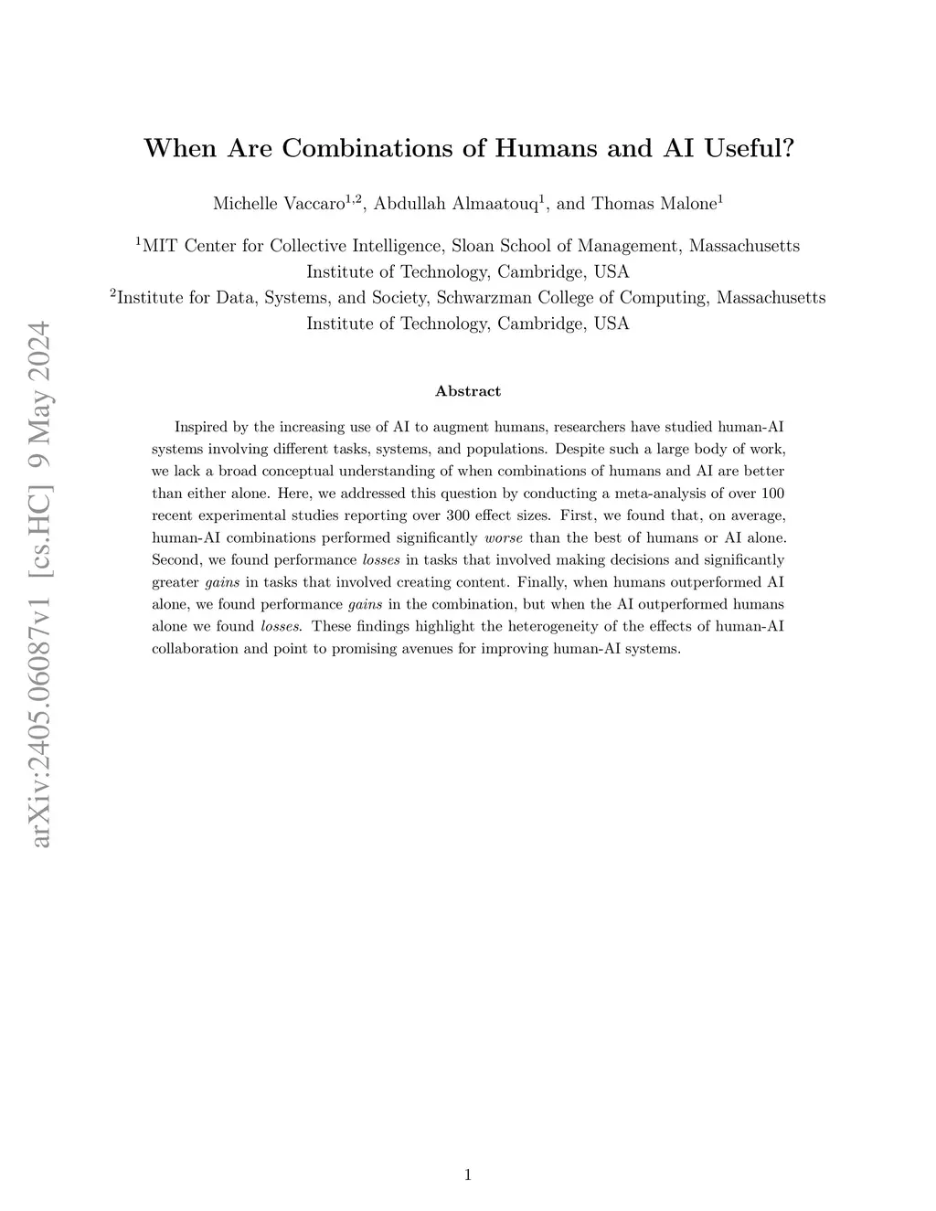 Inspired by the increasing use of AI to augment humans, researchers have studied human-AI systems involving different tasks, systems, and populations. Despite such a large body of work, we lack a broad conceptual understanding of when combinations of humans and AI are better than either alone. Here, we addressed this question by conducting a meta-analysis of over 100 recent experimental studies reporting over 300 effect sizes. First, we found that, on average, human-AI combinations performed significantly worse than the best of humans or AI alone. Second, we found performance losses in tasks that involved making decisions and significantly greater gains in tasks that involved creating content. Finally, when humans outperformed AI alone, we found performance gains in the combination, but when the AI outperformed humans alone we found losses. These findings highlight the heterogeneity of the effects of human-AI collaboration and point to promising avenues for improving human-AI systems.