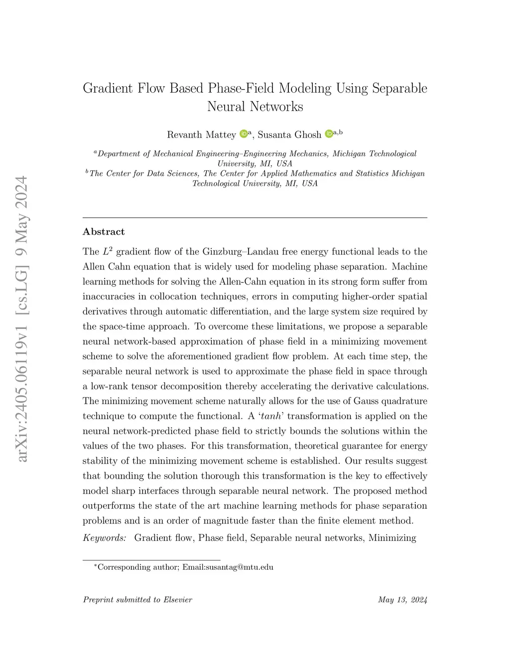 The gradient flow of the Ginzburg-Landau free energy functional leads to the Allen Cahn equation that is widely used for modeling phase separation. Machine learning methods for solving the Allen-Cahn equation in its strong form suffer from inaccuracies in collocation techniques, errors in computing higher-order spatial derivatives through automatic differentiation, and the large system size required by the space-time approach. To overcome these limitations, we propose a separable neural network-based approximation of the phase field in a minimizing movement scheme to solve the aforementioned gradient flow problem. At each time step, the separable neural network is used to approximate the phase field in space through a low-rank tensor decomposition thereby accelerating the derivative calculations. The minimizing movement scheme naturally allows for the use of Gauss quadrature technique to compute the functional. A `' transformation is applied on the neural network-predicted phase field to strictly bounds the solutions within the values of the two phases. For this transformation, a theoretical guarantee for energy stability of the minimizing movement scheme is established. Our results suggest that bounding the solution through this transformation is the key to effectively model sharp interfaces through separable neural network. The proposed method outperforms the state-of-the-art machine learning methods for phase separation problems and is an order of magnitude faster than the finite element method.