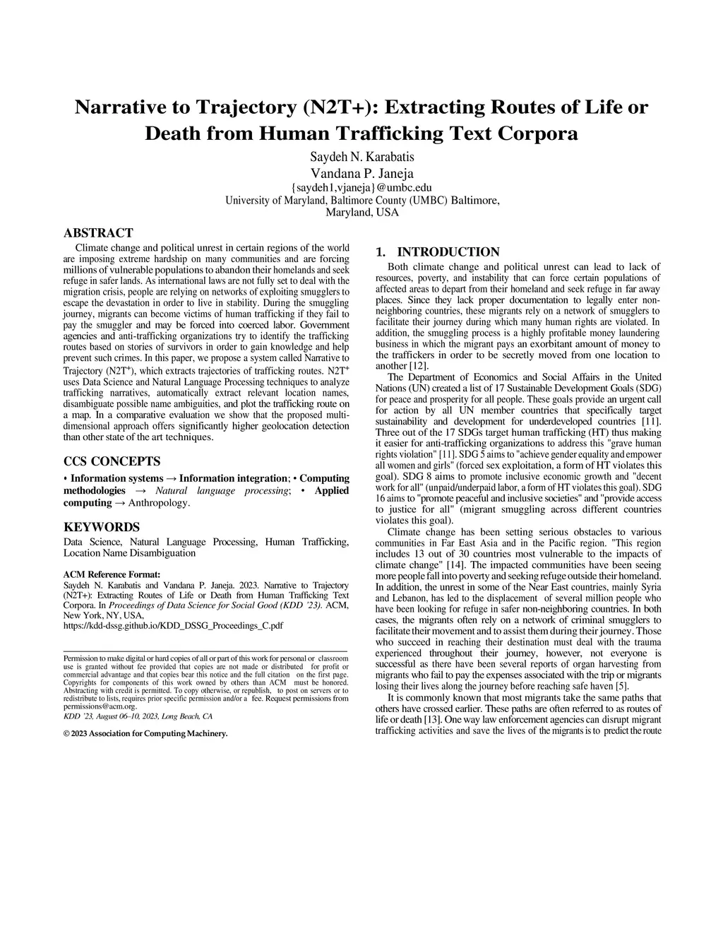 Climate change and political unrest in certain regions of the world are imposing extreme hardship on many communities and are forcing millions of vulnerable populations to abandon their homelands and seek refuge in safer lands. As international laws are not fully set to deal with the migration crisis, people are relying on networks of exploiting smugglers to escape the devastation in order to live in stability. During the smuggling journey, migrants can become victims of human trafficking if they fail to pay the smuggler and may be forced into coerced labor. Government agencies and anti-trafficking organizations try to identify the trafficking routes based on stories of survivors in order to gain knowledge and help prevent such crimes. In this paper, we propose a system called Narrative to Trajectory (N2T+), which extracts trajectories of trafficking routes. N2T+ uses Data Science and Natural Language Processing techniques to analyze trafficking narratives, automatically extract relevant location names, disambiguate possible name ambiguities, and plot the trafficking route on a map. In a comparative evaluation we show that the proposed multi-dimensional approach offers significantly higher geolocation detection than other state of the art techniques.