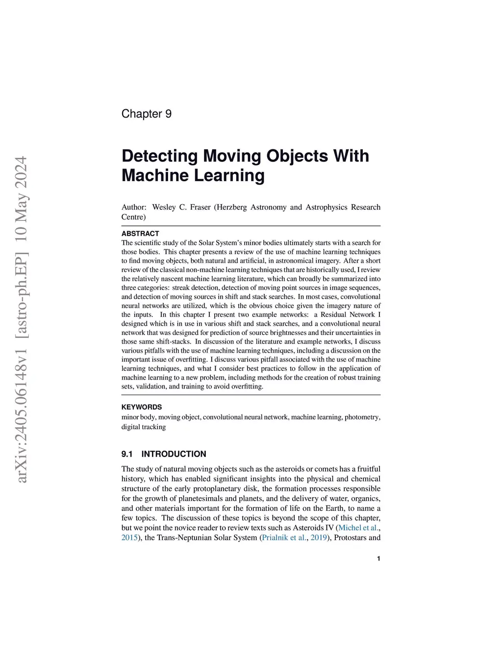 The scientific study of the Solar System's minor bodies ultimately starts with a search for those bodies. This chapter presents a review of the use of machine learning techniques to find moving objects, both natural and artificial, in astronomical imagery. After a short review of the classical non-machine learning techniques that are historically used, I review the relatively nascent machine learning literature, which can broadly be summarized into three categories: streak detection, detection of moving point sources in image sequences, and detection of moving sources in shift and stack searches. In most cases, convolutional neural networks are utilized, which is the obvious choice given the imagery nature of the inputs. In this chapter I present two example networks: a Residual Network I designed which is in use in various shift and stack searches, and a convolutional neural network that was designed for prediction of source brightnesses and their uncertainties in those same shift-stacks. In discussion of the literature and example networks, I discuss various pitfalls with the use of machine learning techniques, including a discussion on the important issue of overfitting. I discuss various pitfall associated with the use of machine learning techniques, and what I consider best practices to follow in the application of machine learning to a new problem, including methods for the creation of robust training sets, validation, and training to avoid overfitting.
