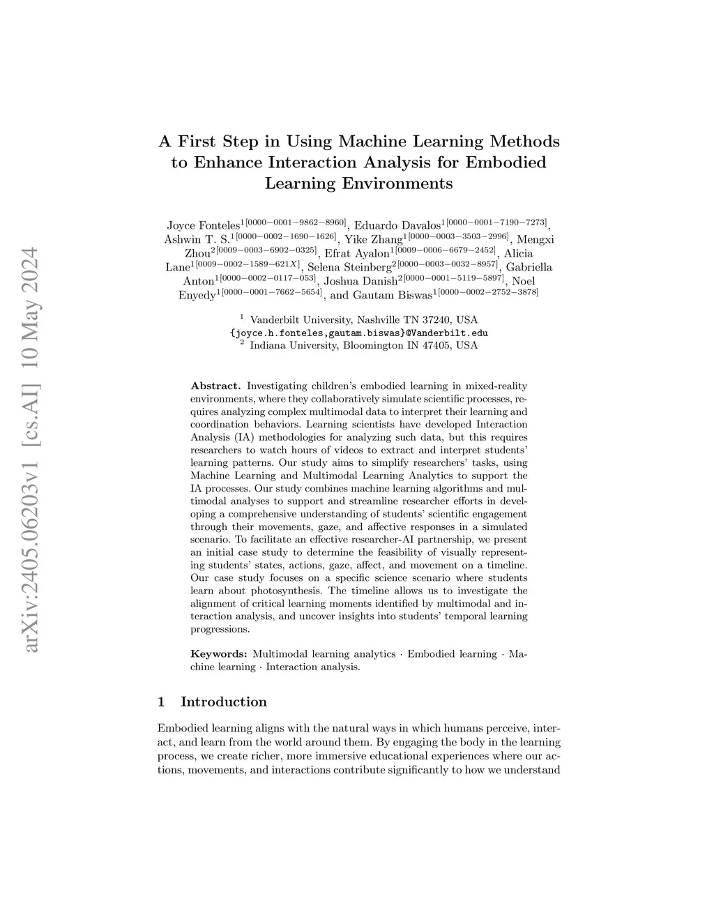 Investigating children's embodied learning in mixed-reality environments, where they collaboratively simulate scientific processes, requires analyzing complex multimodal data to interpret their learning and coordination behaviors. Learning scientists have developed Interaction Analysis (IA) methodologies for analyzing such data, but this requires researchers to watch hours of videos to extract and interpret students' learning patterns. Our study aims to simplify researchers' tasks, using Machine Learning and Multimodal Learning Analytics to support the IA processes. Our study combines machine learning algorithms and multimodal analyses to support and streamline researcher efforts in developing a comprehensive understanding of students' scientific engagement through their movements, gaze, and affective responses in a simulated scenario. To facilitate an effective researcher-AI partnership, we present an initial case study to determine the feasibility of visually representing students' states, actions, gaze, affect, and movement on a timeline. Our case study focuses on a specific science scenario where students learn about photosynthesis. The timeline allows us to investigate the alignment of critical learning moments identified by multimodal and interaction analysis, and uncover insights into students' temporal learning progressions.