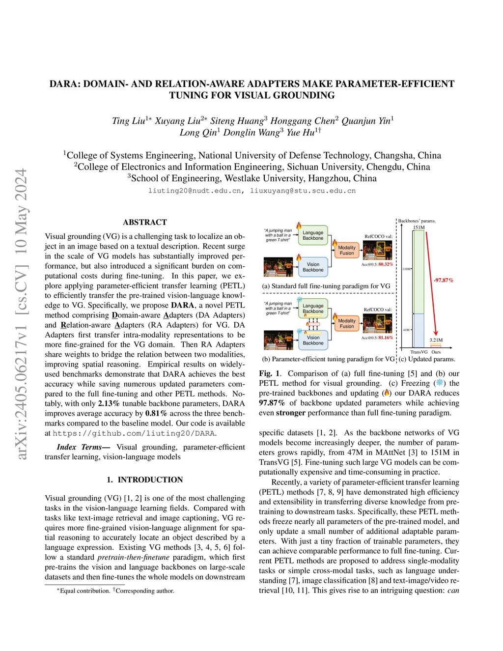Visual grounding (VG) is a challenging task to localize an object in an image based on a textual description. Recent surge in the scale of VG models has substantially improved performance, but also introduced a significant burden on computational costs during fine-tuning. In this paper, we explore applying parameter-efficient transfer learning (PETL) to efficiently transfer the pre-trained vision-language knowledge to VG. Specifically, we propose \textbf{DARA}, a novel PETL method comprising \underline{\textbf{D}}omain-aware \underline{\textbf{A}}dapters (DA Adapters) and \underline{\textbf{R}}elation-aware \underline{\textbf{A}}dapters (RA Adapters) for VG. DA Adapters first transfer intra-modality representations to be more fine-grained for the VG domain. Then RA Adapters share weights to bridge the relation between two modalities, improving spatial reasoning. Empirical results on widely-used benchmarks demonstrate that DARA achieves the best accuracy while saving numerous updated parameters compared to the full fine-tuning and other PETL methods. Notably, with only \textbf{2.13\%} tunable backbone parameters, DARA improves average accuracy by \textbf{0.81\%} across the three benchmarks compared to the baseline model. Our code is available at \url{https://github.com/liuting20/DARA}.