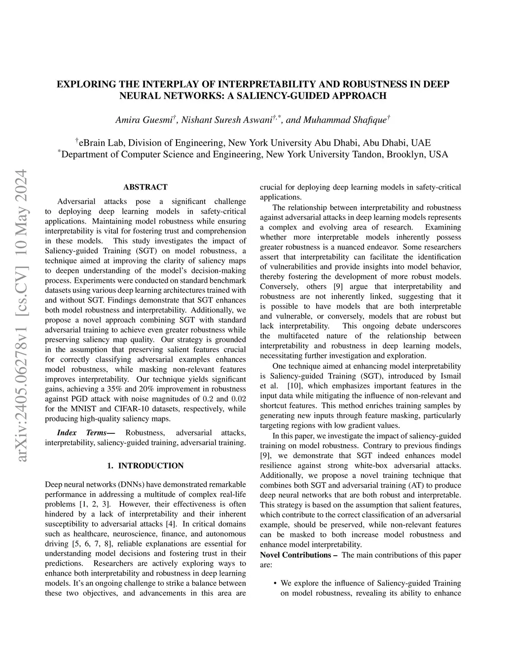 Adversarial attacks pose a significant challenge to deploying deep learning models in safety-critical applications. Maintaining model robustness while ensuring interpretability is vital for fostering trust and comprehension in these models. This study investigates the impact of Saliency-guided Training (SGT) on model robustness, a technique aimed at improving the clarity of saliency maps to deepen understanding of the model's decision-making process. Experiments were conducted on standard benchmark datasets using various deep learning architectures trained with and without SGT. Findings demonstrate that SGT enhances both model robustness and interpretability. Additionally, we propose a novel approach combining SGT with standard adversarial training to achieve even greater robustness while preserving saliency map quality. Our strategy is grounded in the assumption that preserving salient features crucial for correctly classifying adversarial examples enhances model robustness, while masking non-relevant features improves interpretability. Our technique yields significant gains, achieving a 35\% and 20\% improvement in robustness against PGD attack with noise magnitudes of and for the MNIST and CIFAR-10 datasets, respectively, while producing high-quality saliency maps.