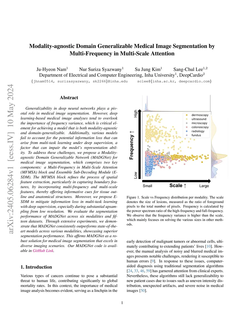 Generalizability in deep neural networks plays a pivotal role in medical image segmentation. However, deep learning-based medical image analyses tend to overlook the importance of frequency variance, which is critical element for achieving a model that is both modality-agnostic and domain-generalizable. Additionally, various models fail to account for the potential information loss that can arise from multi-task learning under deep supervision, a factor that can impair the model representation ability. To address these challenges, we propose a Modality-agnostic Domain Generalizable Network (MADGNet) for medical image segmentation, which comprises two key components: a Multi-Frequency in Multi-Scale Attention (MFMSA) block and Ensemble Sub-Decoding Module (E-SDM). The MFMSA block refines the process of spatial feature extraction, particularly in capturing boundary features, by incorporating multi-frequency and multi-scale features, thereby offering informative cues for tissue outline and anatomical structures. Moreover, we propose E-SDM to mitigate information loss in multi-task learning with deep supervision, especially during substantial upsampling from low resolution. We evaluate the segmentation performance of MADGNet across six modalities and fifteen datasets. Through extensive experiments, we demonstrate that MADGNet consistently outperforms state-of-the-art models across various modalities, showcasing superior segmentation performance. This affirms MADGNet as a robust solution for medical image segmentation that excels in diverse imaging scenarios. Our MADGNet code is available in GitHub Link.