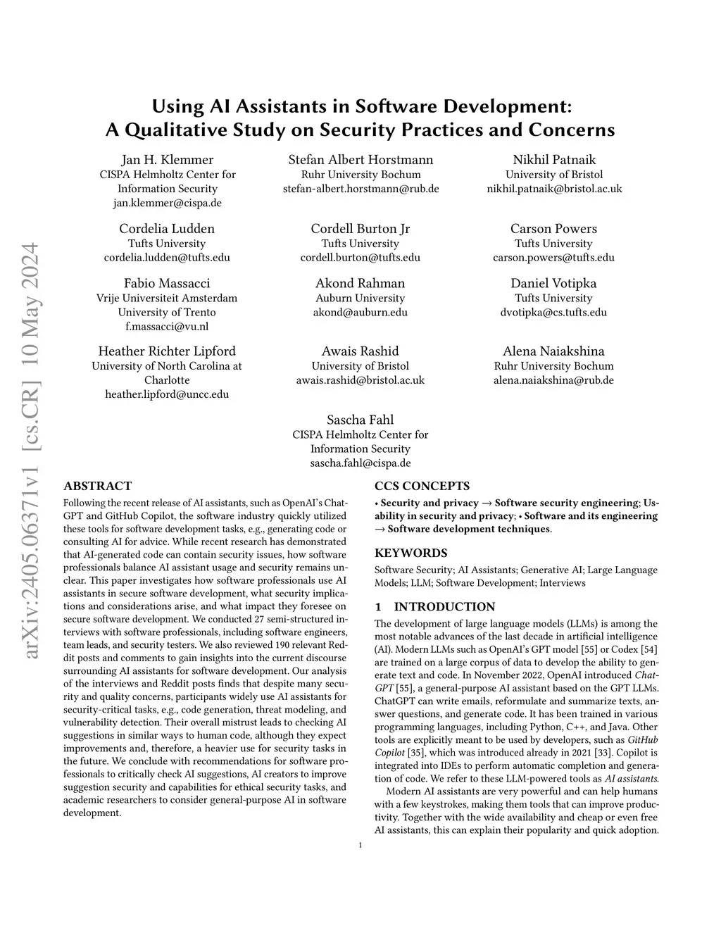 Following the recent release of AI assistants, such as OpenAI's ChatGPT and GitHub Copilot, the software industry quickly utilized these tools for software development tasks, e.g., generating code or consulting AI for advice. While recent research has demonstrated that AI-generated code can contain security issues, how software professionals balance AI assistant usage and security remains unclear. This paper investigates how software professionals use AI assistants in secure software development, what security implications and considerations arise, and what impact they foresee on secure software development. We conducted 27 semi-structured interviews with software professionals, including software engineers, team leads, and security testers. We also reviewed 190 relevant Reddit posts and comments to gain insights into the current discourse surrounding AI assistants for software development. Our analysis of the interviews and Reddit posts finds that despite many security and quality concerns, participants widely use AI assistants for security-critical tasks, e.g., code generation, threat modeling, and vulnerability detection. Their overall mistrust leads to checking AI suggestions in similar ways to human code, although they expect improvements and, therefore, a heavier use for security tasks in the future. We conclude with recommendations for software professionals to critically check AI suggestions, AI creators to improve suggestion security and capabilities for ethical security tasks, and academic researchers to consider general-purpose AI in software development.