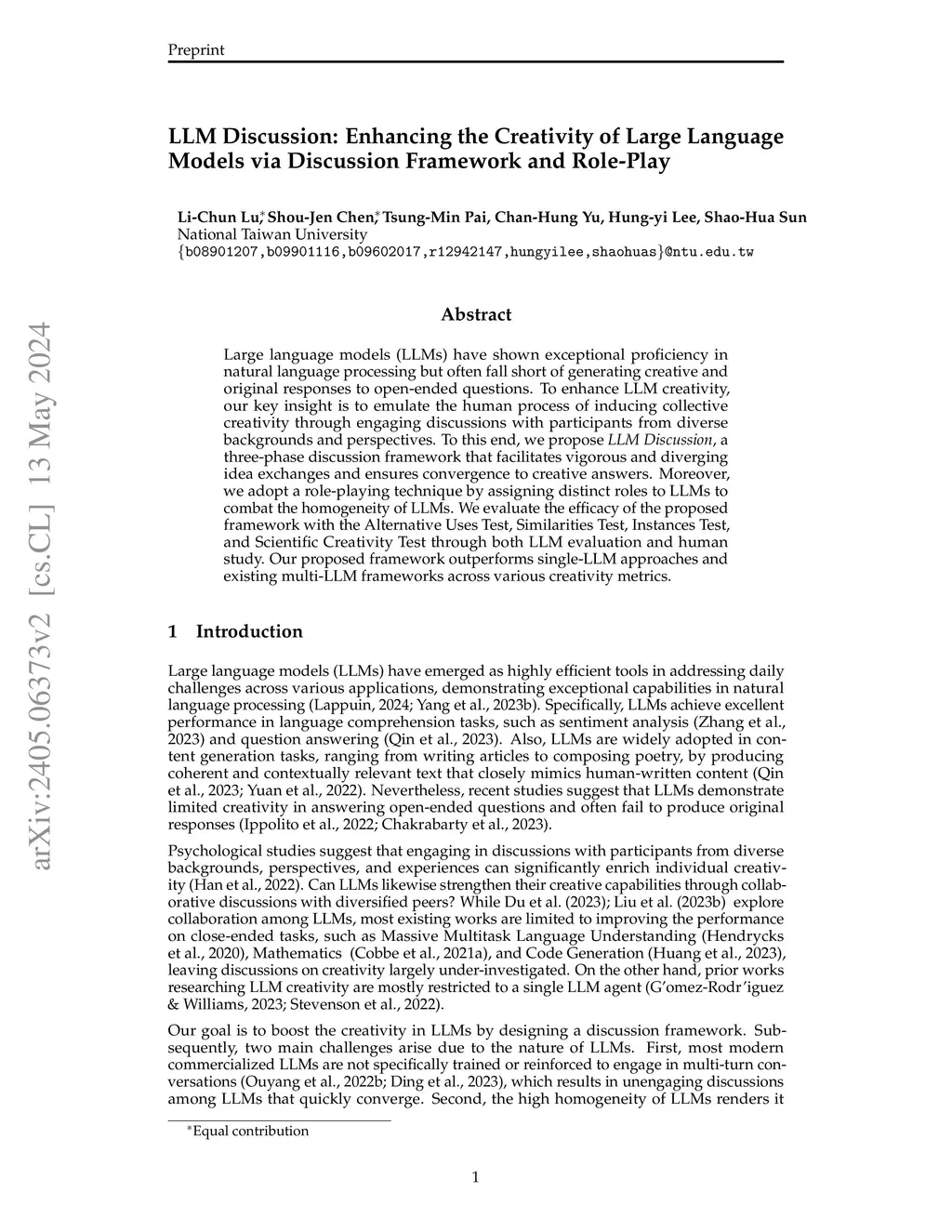 Large language models (LLMs) have shown exceptional proficiency in natural language processing but often fall short of generating creative and original responses to open-ended questions. To enhance LLM creativity, our key insight is to emulate the human process of inducing collective creativity through engaging discussions with participants from diverse backgrounds and perspectives. To this end, we propose LLM Discussion, a three-phase discussion framework that facilitates vigorous and diverging idea exchanges and ensures convergence to creative answers. Moreover, we adopt a role-playing technique by assigning distinct roles to LLMs to combat the homogeneity of LLMs. We evaluate the efficacy of the proposed framework with the Alternative Uses Test, Similarities Test, Instances Test, and Scientific Creativity Test through both LLM evaluation and human study. Our proposed framework outperforms single-LLM approaches and existing multi-LLM frameworks across various creativity metrics.