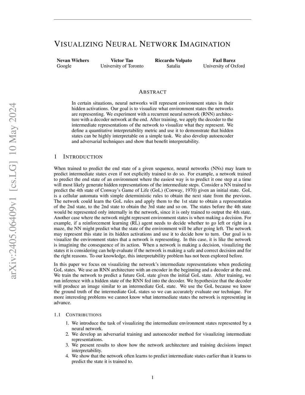 In certain situations, neural networks will represent environment states in their hidden activations. Our goal is to visualize what environment states the networks are representing. We experiment with a recurrent neural network (RNN) architecture with a decoder network at the end. After training, we apply the decoder to the intermediate representations of the network to visualize what they represent. We define a quantitative interpretability metric and use it to demonstrate that hidden states can be highly interpretable on a simple task. We also develop autoencoder and adversarial techniques and show that benefit interpretability.