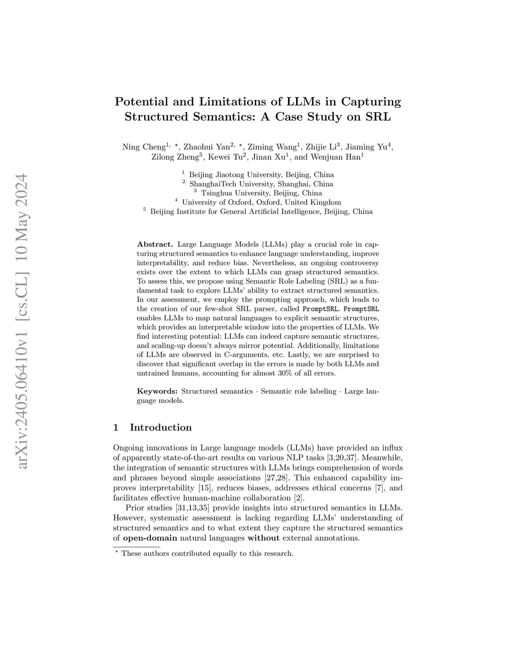 Large Language Models (LLMs) play a crucial role in capturing structured semantics to enhance language understanding, improve interpretability, and reduce bias. Nevertheless, an ongoing controversy exists over the extent to which LLMs can grasp structured semantics. To assess this, we propose using Semantic Role Labeling (SRL) as a fundamental task to explore LLMs' ability to extract structured semantics. In our assessment, we employ the prompting approach, which leads to the creation of our few-shot SRL parser, called PromptSRL. PromptSRL enables LLMs to map natural languages to explicit semantic structures, which provides an interpretable window into the properties of LLMs. We find interesting potential: LLMs can indeed capture semantic structures, and scaling-up doesn't always mirror potential. Additionally, limitations of LLMs are observed in C-arguments, etc. Lastly, we are surprised to discover that significant overlap in the errors is made by both LLMs and untrained humans, accounting for almost 30% of all errors.