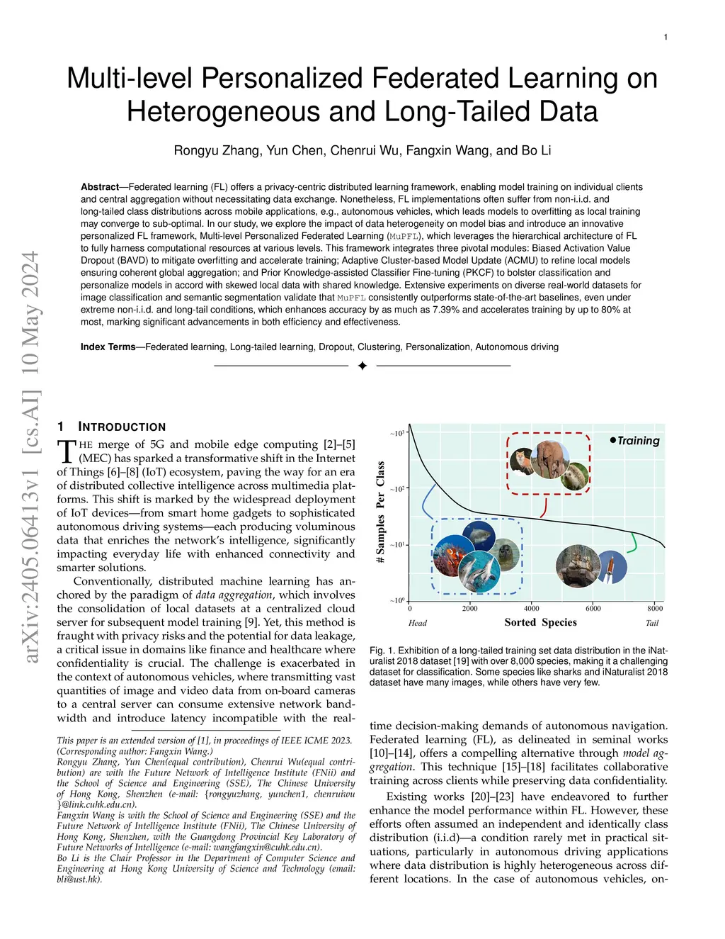Federated learning (FL) offers a privacy-centric distributed learning framework, enabling model training on individual clients and central aggregation without necessitating data exchange. Nonetheless, FL implementations often suffer from non-i.i.d. and long-tailed class distributions across mobile applications, e.g., autonomous vehicles, which leads models to overfitting as local training may converge to sub-optimal. In our study, we explore the impact of data heterogeneity on model bias and introduce an innovative personalized FL framework, Multi-level Personalized Federated Learning (MuPFL), which leverages the hierarchical architecture of FL to fully harness computational resources at various levels. This framework integrates three pivotal modules: Biased Activation Value Dropout (BAVD) to mitigate overfitting and accelerate training; Adaptive Cluster-based Model Update (ACMU) to refine local models ensuring coherent global aggregation; and Prior Knowledge-assisted Classifier Fine-tuning (PKCF) to bolster classification and personalize models in accord with skewed local data with shared knowledge. Extensive experiments on diverse real-world datasets for image classification and semantic segmentation validate that MuPFL consistently outperforms state-of-the-art baselines, even under extreme non-i.i.d. and long-tail conditions, which enhances accuracy by as much as 7.39% and accelerates training by up to 80% at most, marking significant advancements in both efficiency and effectiveness.