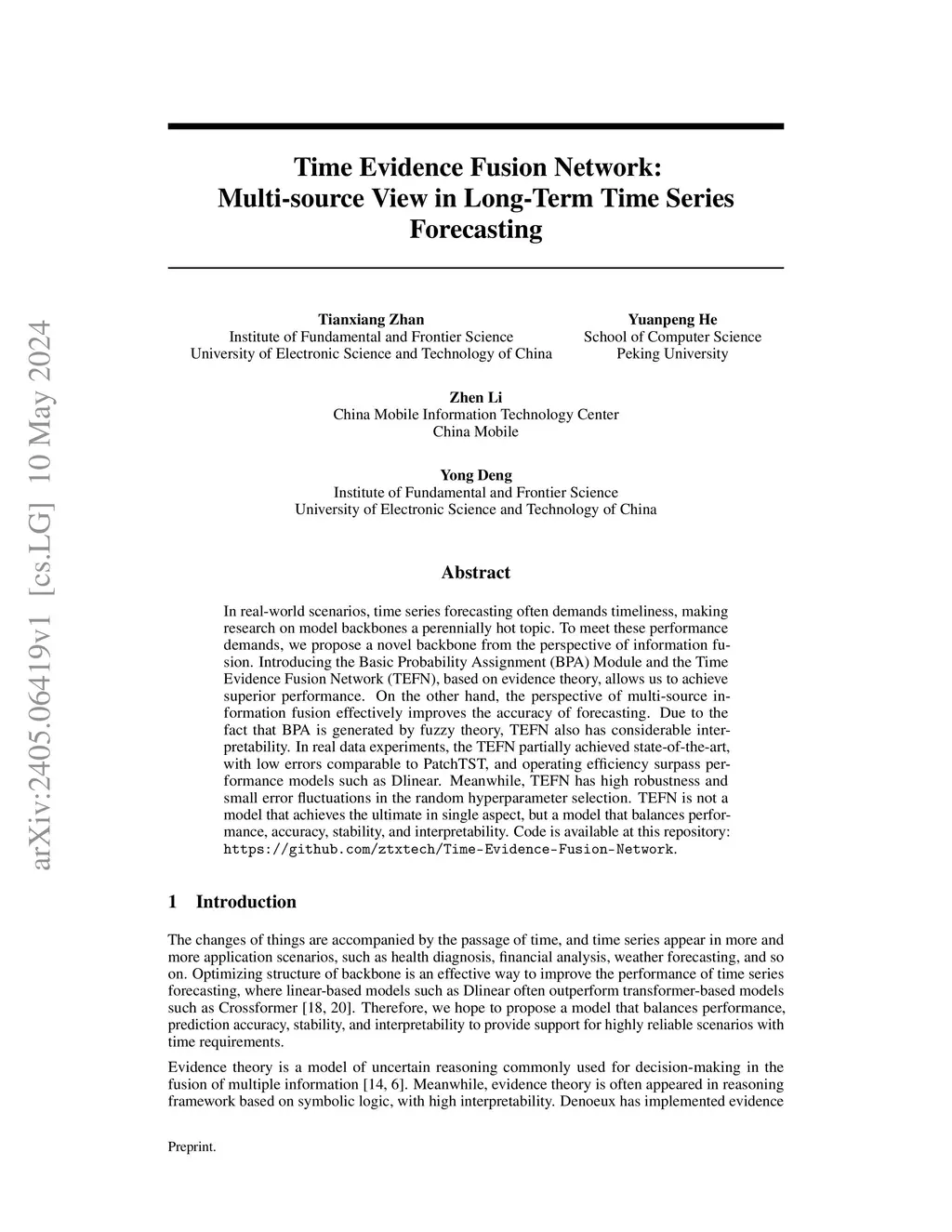 In practical scenarios, time series forecasting necessitates not only accuracy but also efficiency. Consequently, the exploration of model architectures remains a perennially trending topic in research. To address these challenges, we propose a novel backbone architecture named Time Evidence Fusion Network (TEFN) from the perspective of information fusion. Specifically, we introduce the Basic Probability Assignment (BPA) Module based on evidence theory to capture the uncertainty of multivariate time series data from both channel and time dimensions. Additionally, we develop a novel multi-source information fusion method to effectively integrate the two distinct dimensions from BPA output, leading to improved forecasting accuracy. Lastly, we conduct extensive experiments to demonstrate that TEFN achieves performance comparable to state-of-the-art methods while maintaining significantly lower complexity and reduced training time. Also, our experiments show that TEFN exhibits high robustness, with minimal error fluctuations during hyperparameter selection. Furthermore, due to the fact that BPA is derived from fuzzy theory, TEFN offers a high degree of interpretability. Therefore, the proposed TEFN balances accuracy, efficiency, stability, and interpretability, making it a desirable solution for time series forecasting.